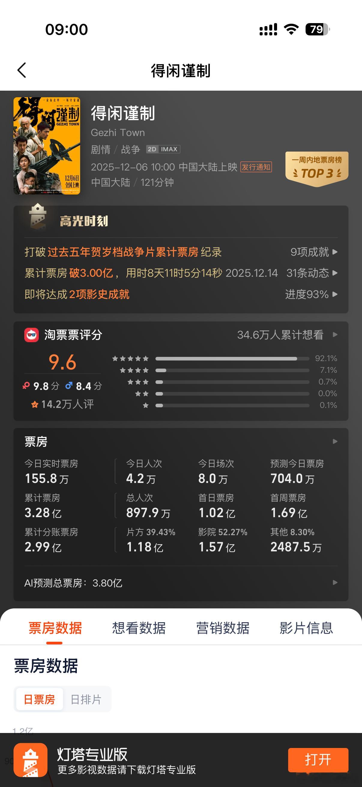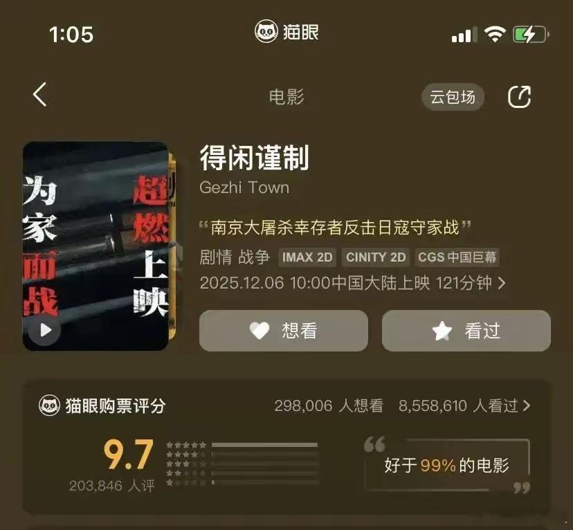 得闲谨制《得闲谨制》十一天破3亿,800多万人进场打卡,日均近3000万的成绩,放在今年国产片里已是“优等生”——毕竟年度过4亿的片子才20来部,它早超了1.2亿的行业平均水平,没赔本没哑火已然成功~得闲谨制