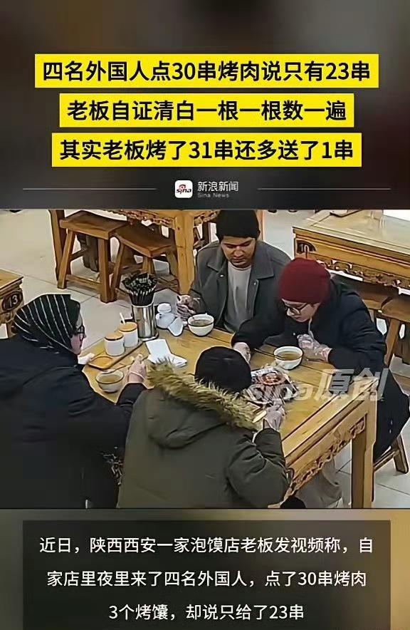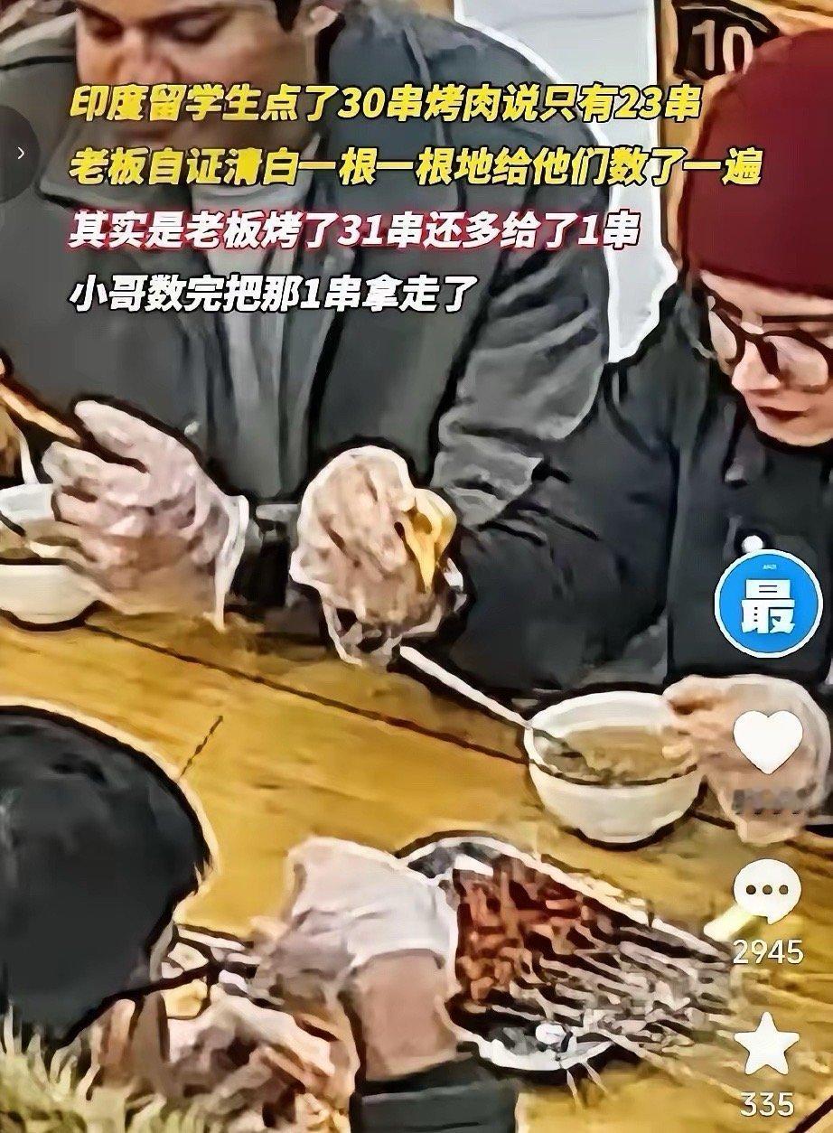 搞半天原来是印度留学生,还以为是哪个地方的人都不识数了吗? 近日,四名印度留学生在西安的一家泡馍店吃东西,他们点了30串烤肉串,但他们说烤肉串的数量不对,少了,只有23串!就去向店里服务员反映。 然后店里的小哥就去数了一遍,发现是31串于是就拿走了一串,但这四位顾客还是不信,还是声称只有23串,于是找老板,老板过来后,当着他们面一串一串的数给他们看,才数到20的时候,其中一名女子就说,好了好了!但老板坚持数完,最终整整30串!老板其实烤了31串,送他们一串,搞成这样就拿走了。 看这肤色应该是高种姓的,怎么连数数都不会数?