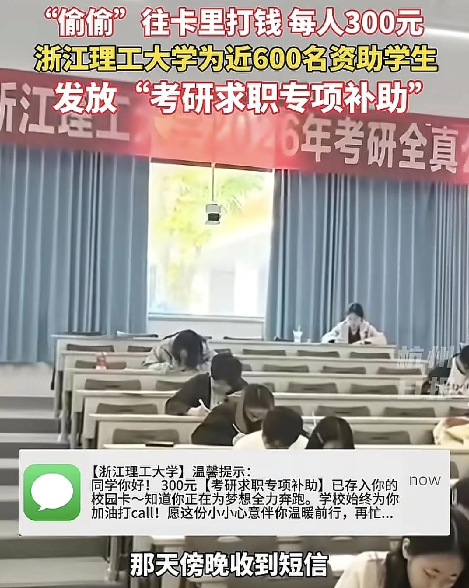 浙江理工大学有同学最近收到了短信,自己的饭卡里无意中多了300块钱。同学专门跟辅导员确认了一下,这是学校专门给考研求职的学生补助,每人都会得到300块钱。学生们觉得很暖心,虽然钱不算多,但是在这条艰难的道路上,算是一种正能量的鼓励。