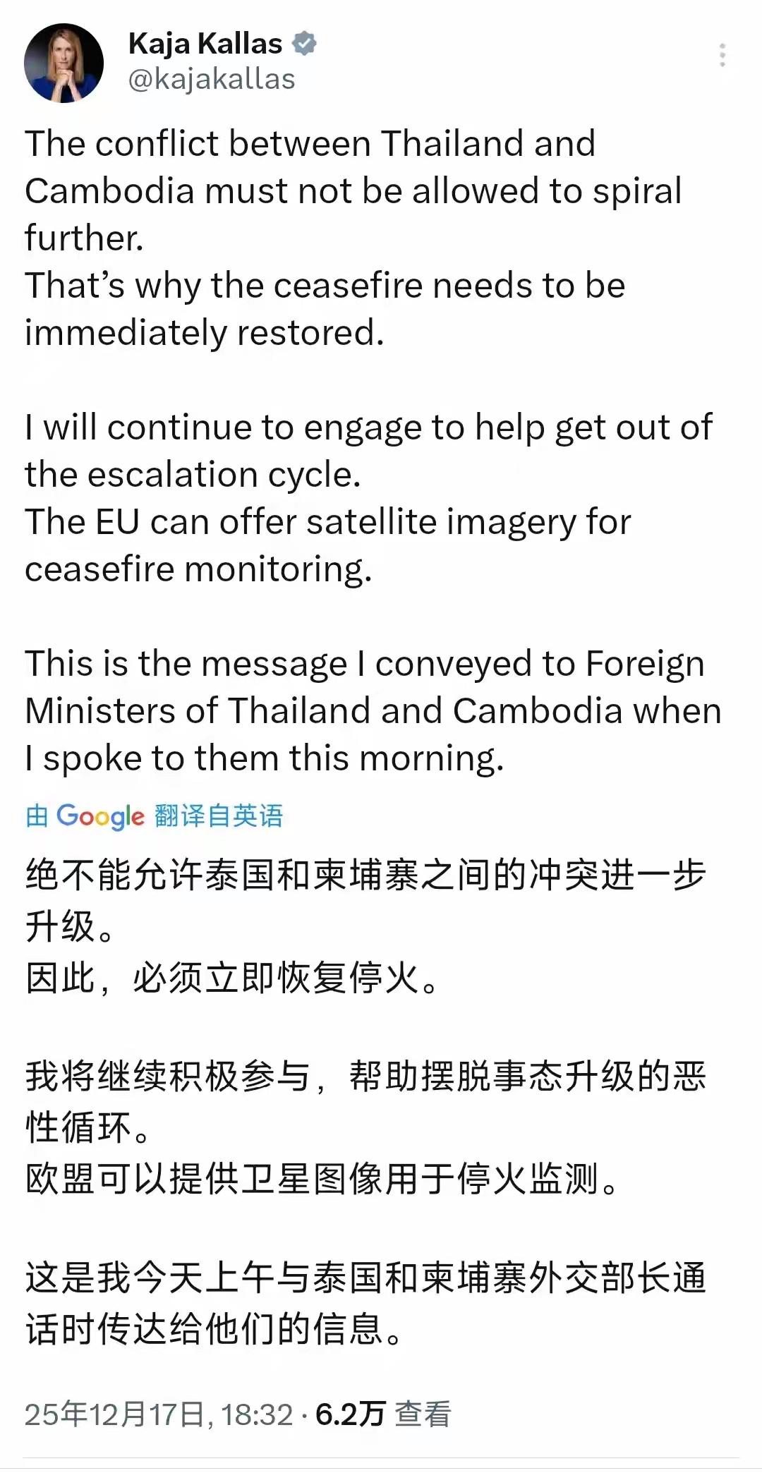 17日,欧盟外长卡拉斯发文称:“绝不允许泰国和柬埔寨之间的冲突进一步升级。因此,必须立即恢复停火!”她表示,将继续积极参与,帮助摆脱事态升级的恶性循环。欧盟可以提供卫星图像用于停火监测。 听卡拉斯的口气似乎比特朗普还大!泰国和柬埔寨之间的事,本来就是人家俩东南亚国家的领土矛盾,啥时候轮到远在欧洲的欧盟来瞎操心了? 欧洲政客这些年在国际事务里总想刷存在感,通过插手别国事务来彰个人影响力,借此谋求自身更大发展。通俗的说就是“蹭流量”!