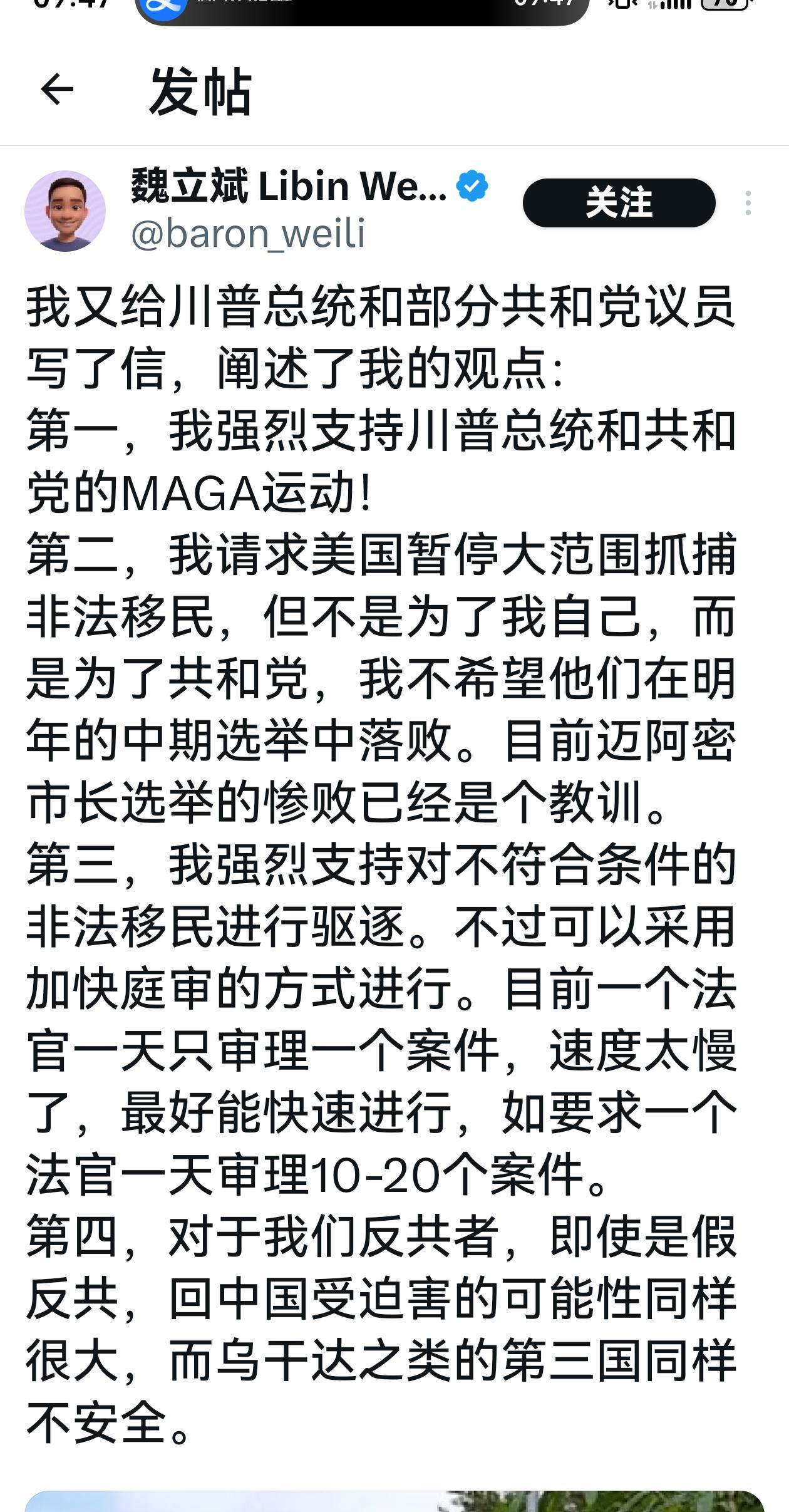 一个跑到美国的“反共者”给特朗普和共和党议员写信,哀求不要驱逐自已:第一,坚决效忠川普和MAGA!第二,请求暂停大范围抓捕非法移民,不是为自己,而是为共和党,不希望他们在明年的中期选举中落败。第三,强烈支持对不符合条件的非法移民进行驱逐。可以采用加快庭审的方式进行。目前一个法官一天只审理一个案件太慢。第四,对于反共者,即使是假反共,回中国很危险,而送到乌干达同样不安全。