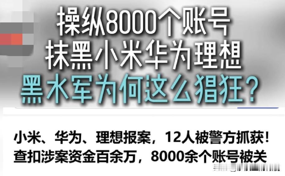操纵8000水军,黑小米,理想和华为。黑水军怎么来的? 8000个账号,黑小米,华为和理想,这还只是一家公司搞的。很多人看到这里开始可怜这些受害品牌了。要我说,没必要。因为大家要明白一个道理,单纯打击黑水军的意义其实是不大的,争夺流量才是黑水军存在的根本原因。 想想以前的油车时代,车圈哪有这么大的关注度?但是从造车新势力从互联网公司来了之后,他们就开始玩流量打法了。一家公司隔三差五的搞点大新闻,他家的流量就会越来越大,越来越高。这个东西,它是会切实的影响舆论和口碑的,然后再转化成销量。 那你家流量大,别家就看不下去了。产品营销如果一时半会跟不上,就只能去找黑水军了。慢慢的,黑水军就把整个车圈的氛围带坏了,车企之间粉丝之间就慢慢开始互喷了。 这里面其实车企和消费者都受伤了,消费者被蒙蔽了双眼,车企花了钱增加了成本,还挡不住被黑,只有黑水军公司赚钱。 所以这就是个一个巴掌拍不响的事,谁也别说谁。大家别不信,我们可以观察一个很有意思的现象,那些营销比较安分的车企被黑的也很少,比如小鹏,比如零跑,是不是这么回事?