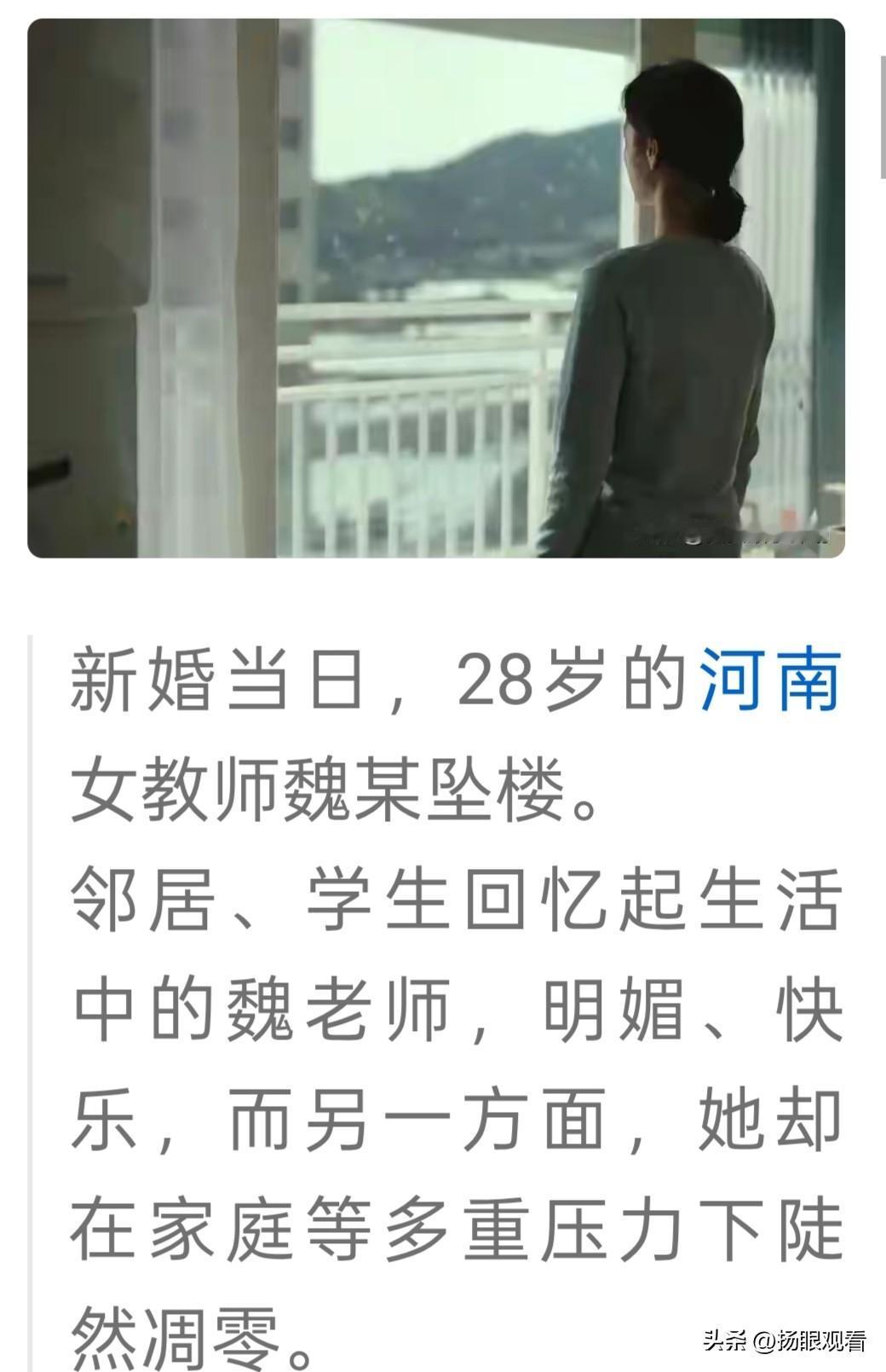 新婚之日坠楼的女教师,她的人生碎了 我刷到这个新闻真的破防了💔 28岁的河南女教师魏某,新婚当天从婚房7楼一跃而下,永远停在了本该是幸福开端的日子。 她明明是那么好的一个老师啊✨ 历史岗位笔试综合双第一考入重点高中,把枯燥的历史讲成故事。 清晨5:50到校盯早读,晚上9:10才下班,带两个百余人的班级,成绩稳居年级前列。 会温柔鼓励背书的学生,会给隔离返校的孩子分享零食,穿新中式衣服还会笑着让学生夸夸自己。 可谁能想到,这样明媚的她,背后是11年的催婚牢笼。 17岁开始被父母逼着相亲,工作后工资被母亲收走,只留500块生活费。 她偷偷攒的3万块,是想去西安看兵马俑、考历史研究生的梦。 而父母收下的27万彩礼,早就被规划给弟弟娶媳妇。 婚纱照里的她眼神黯淡,抿着嘴没有一丝笑意。 婚礼前一天,她还在学校上完所有课才请假。 结婚当天,她穿着深色棉衣牛仔裤,对亲友的问候毫无回应。 最后以换衣服为由支开所有人,选择了诀别。 她的最后一条朋友圈写着:“其实并不想结婚,但是我听话” 遗言里说,拜托朋友有风有太阳的日子扬了骨灰,“下辈子只想要自由”。 更让人心寒的是,她走后 娘家说她已嫁出不算自家人,婆家以婚礼没完成拒认 两家人为27万彩礼争执不休,连她的遗体都在寒冬里躺了一天。 原来“为你好”的道德绑架,真的能杀人。 原来重男轻女的枷锁,能把一个女孩的人生碾碎。 她不是抑郁,她只是被这窒息的生活,逼到了绝路。