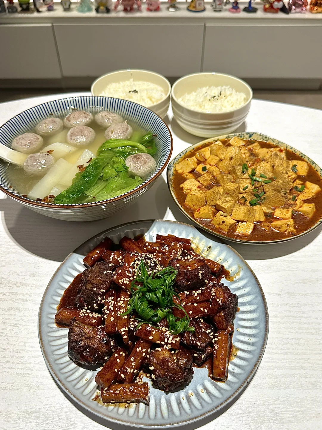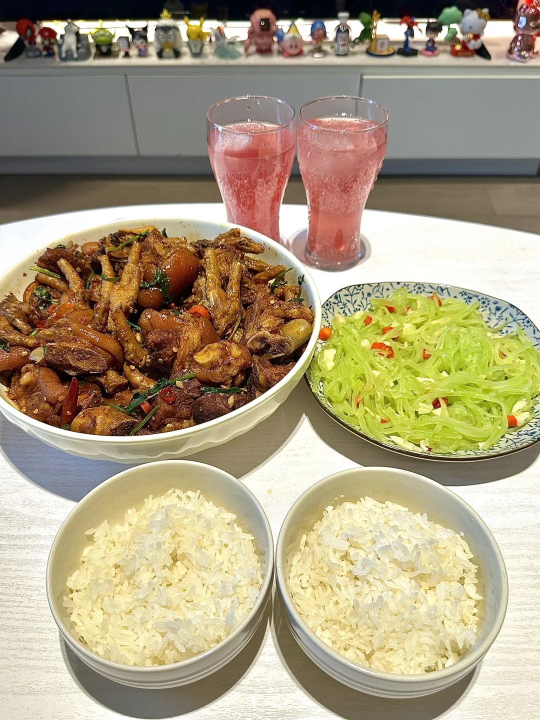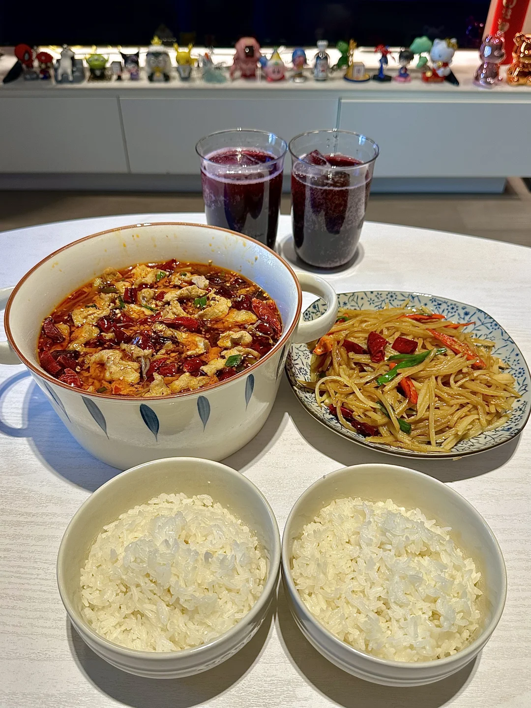 1⃣️鸡公煲·红薯糖水 2⃣️水煮肉片·酸辣土豆丝 3⃣️猪蹄烧鸡爪·清炒莴笋丝 4⃣️油泼番茄鸡蛋面 5⃣️糖醋小排·麻婆豆腐·萝卜酒肉丸汤 6⃣️卤肉饭·黄油芥末罗氏虾 7⃣️ 酸汤火锅 具体教程主页都有哦🍚搜索菜名即可~