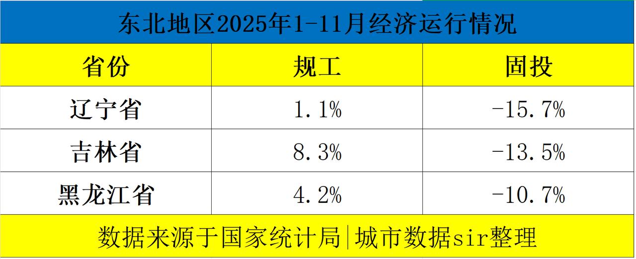 东北三省2025年前11月份经济运行情况,辽宁拉跨,吉林强劲! 从数据来看,2025年前11月份吉林省的经济增长数据最为亮眼,规上工业增加值增速累计达到8.3%,位列东三省第一;黑龙江省数据较为平稳;辽宁省规上工业增加值增速累计仅有1.1%,表现不佳。 主要城市经济预测: 吉林省:由于吉林省的强省会政策,长春市2024年GDP为7632.19亿元,今年有希望迈入8000亿元大关,达到历史新高; 辽宁省:鉴于沈阳市与大连市前10月经济增长表现,大连市化工业、造船业、新能源汽车业可能继续突飞猛进,大概率今年GDP迈入万亿元大关,成为东北首座GDP破万亿城市;沈阳市可能由于宝马汽车产业持续受挫,GDP迈入9300亿元,为其近5年来经济增长最低迷的一年。 黑龙江省:由于黑龙江省数据较为平稳,哈尔滨市GDP预计今年可突破6300亿元。 辽宁吉林黑龙江
