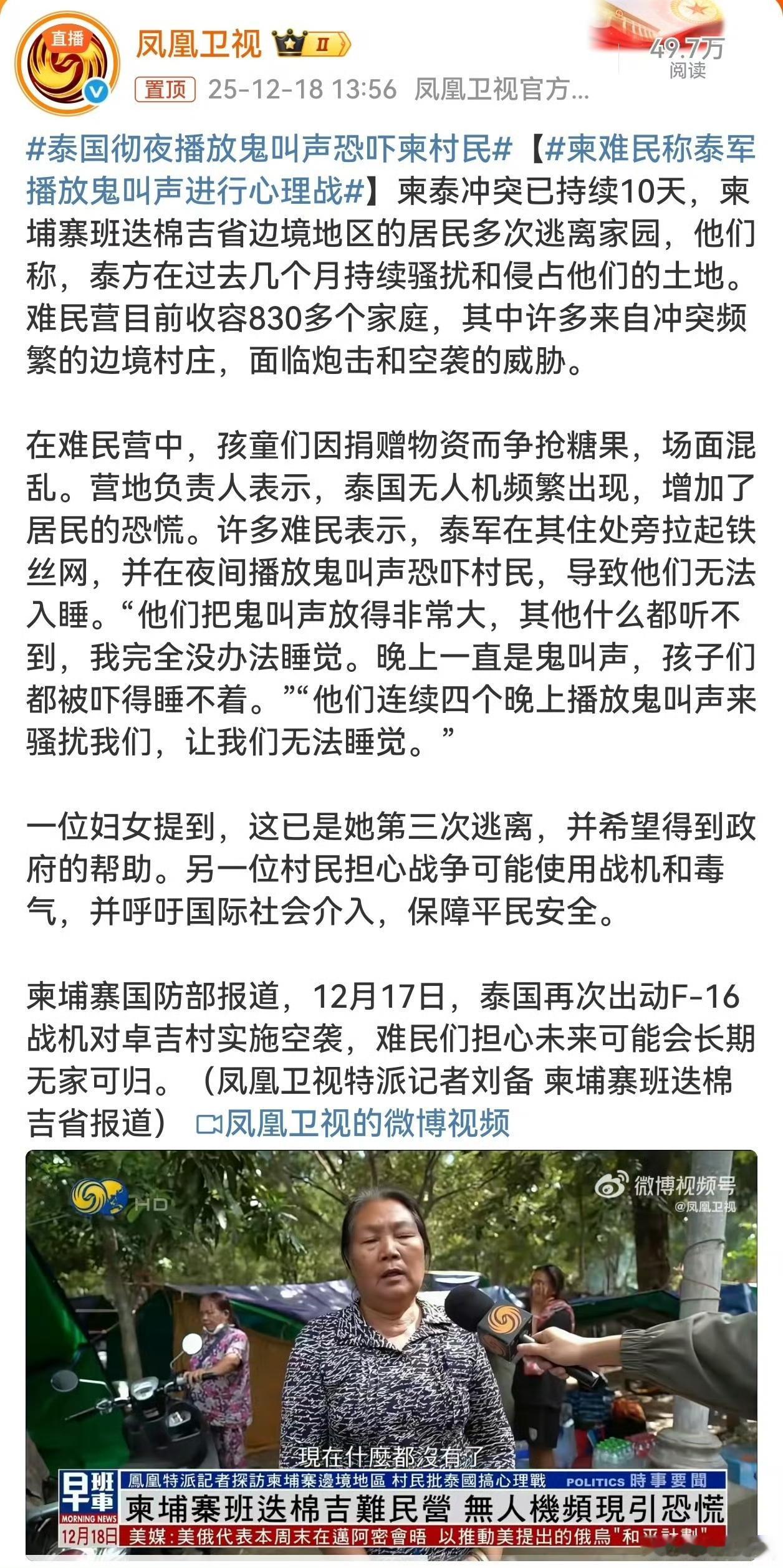 我想过泰国会用枪打柬埔寨, 也想过会偷袭柬埔寨, 万万没想到泰国会彻夜放鬼叫声恐吓柬村民。 泰军12月冲突升级后连续四天彻夜实施,以亚洲恐怖文化为背景的“鬼魂哀嚎”为主,混合飞机引擎噪音,音量极大以致村民“听不到其他声音”。 同步在村民住处旁架设铁丝网,配合无人机频繁侦察加剧恐慌,部分居民出现长期失眠、精神崩溃。 不愧是鬼片大国。。不光是每个泰国人都有鬼片情节。。就连打仗也用上了,看来心理战这招在现代依然好用。 我们以为的现代战争都是什么激光武器,生化武器,高超音速武器,气象战,电子战! 实际上却是,投放装满屎尿的气球,互相投掷石块,播放恐怖音乐,海上滋水枪,飞机散发传单等等。 希望泰国柬埔寨双方接受呼吁和调解,早日实现和平! ​