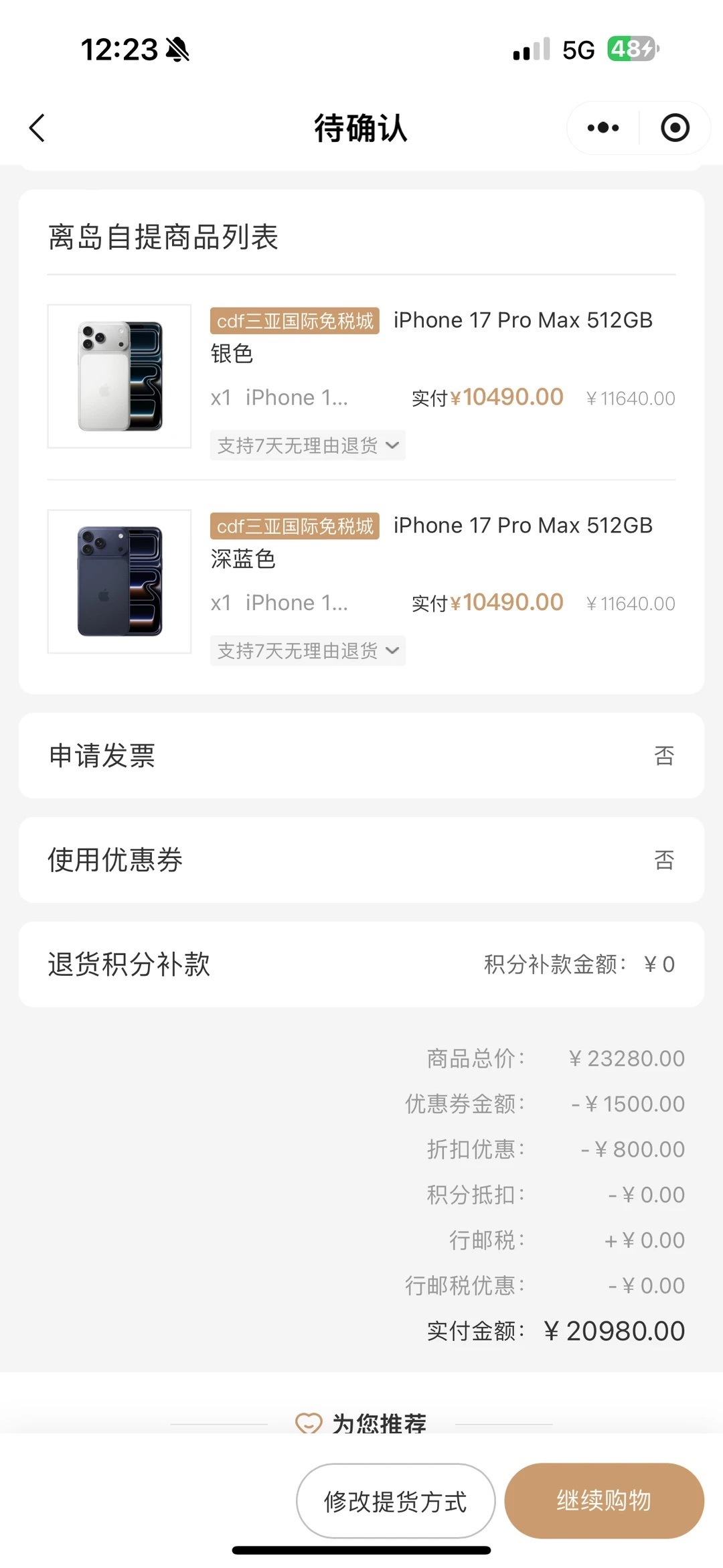 海南封关首日iPhone最高可减2140元今天看见可以用消费券了 直接下单🈵20000-1500 iphone17pm 512g到手10490谢谢封关