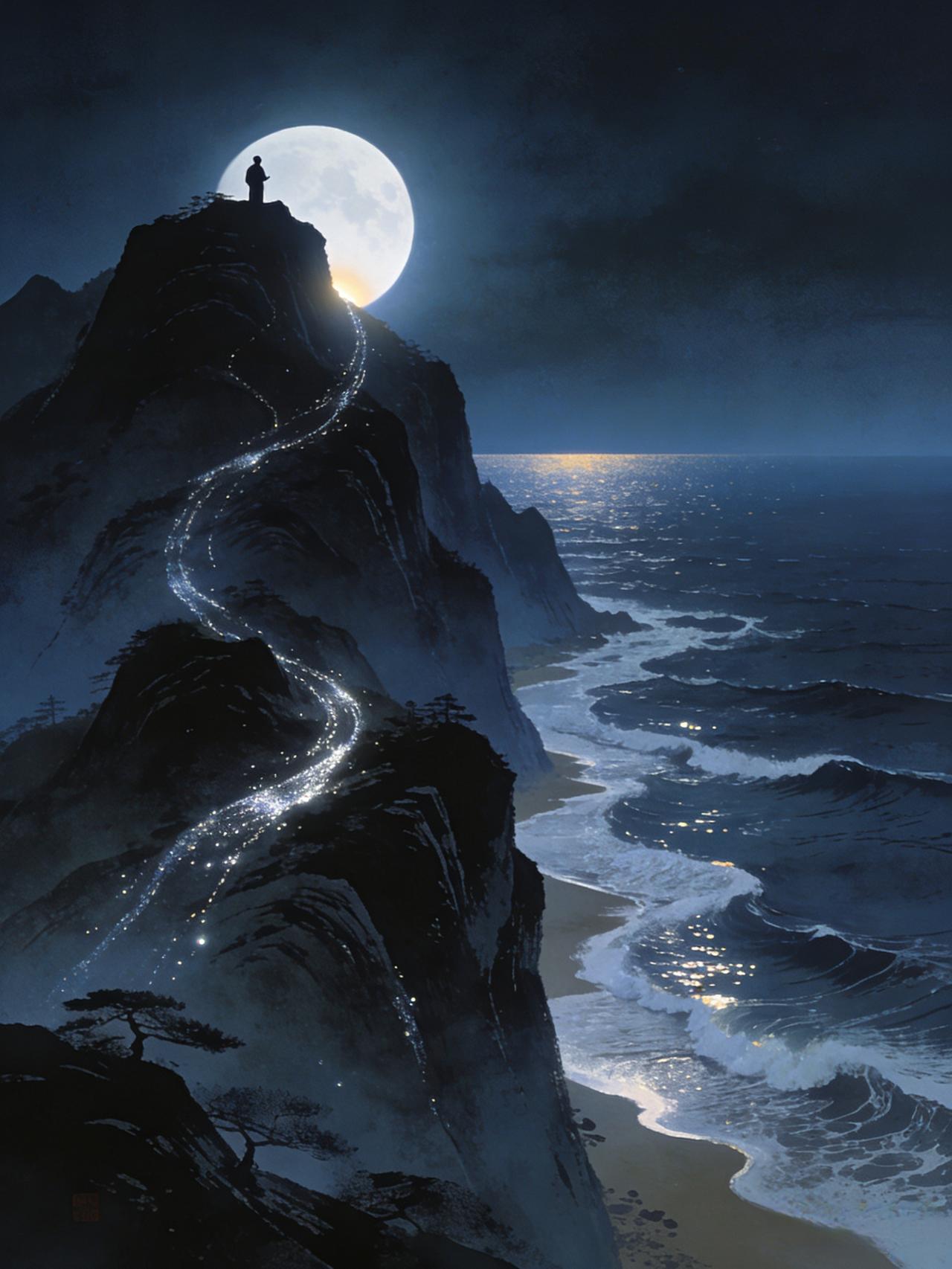 西山观月落,东海闻潮升。 对联要追求极致的对仗。西对东,山对海,观对闻(两种不同的感官体验),月对潮(都有圆缺涨落的生命周期),落对升。 一副对联,10个字,营造出广博浩瀚的自然景象。有呼应,也有对比。同时隐喻了人生的浮沉与悲欢。但最后一个升字对应上联的落,体现了本人几经起伏后的积极心态。