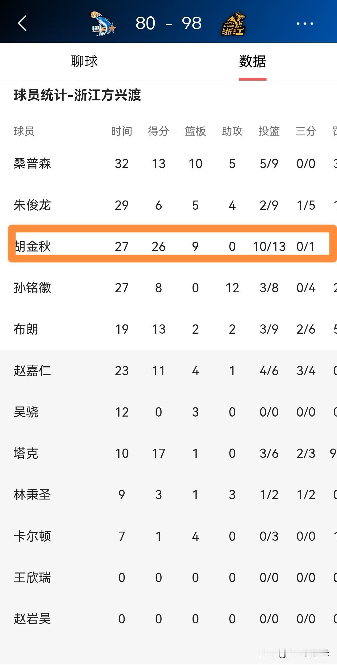 浙江方兴渡超级巨星胡金秋真是稳定的可怕!在今天浙江方兴渡客场以98:80击败福建晋江文旅的比赛中,胡金秋首发出战27分钟,投篮13中10,其中罚球6中6极其高效的砍下26分9篮板2抢断,没有出现任何的失误,他的场上正负值为+9。 毫不夸张的说,放眼当今CBA,能够像胡金秋这样稳定高效的球员真是凤毛麟角。