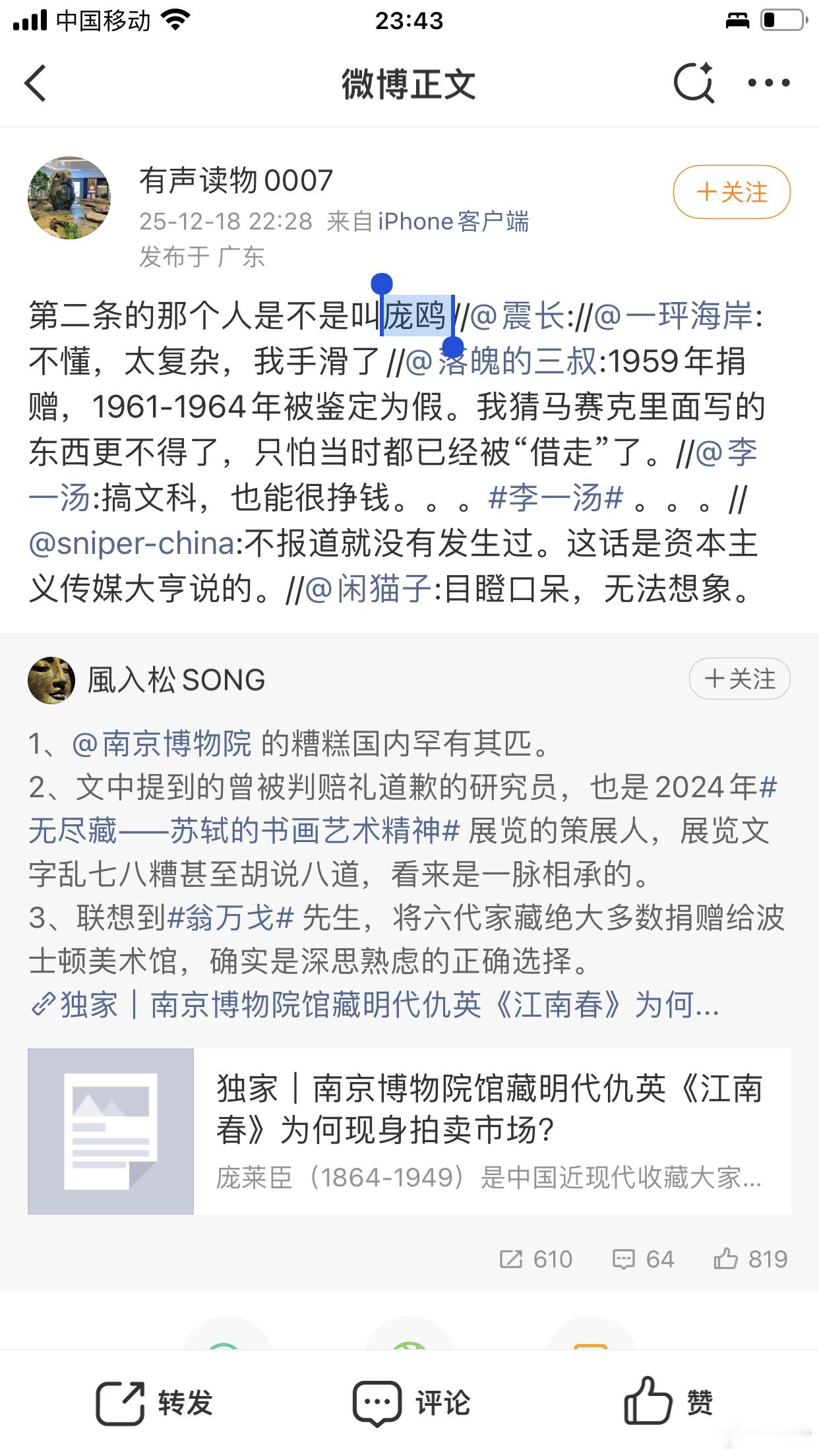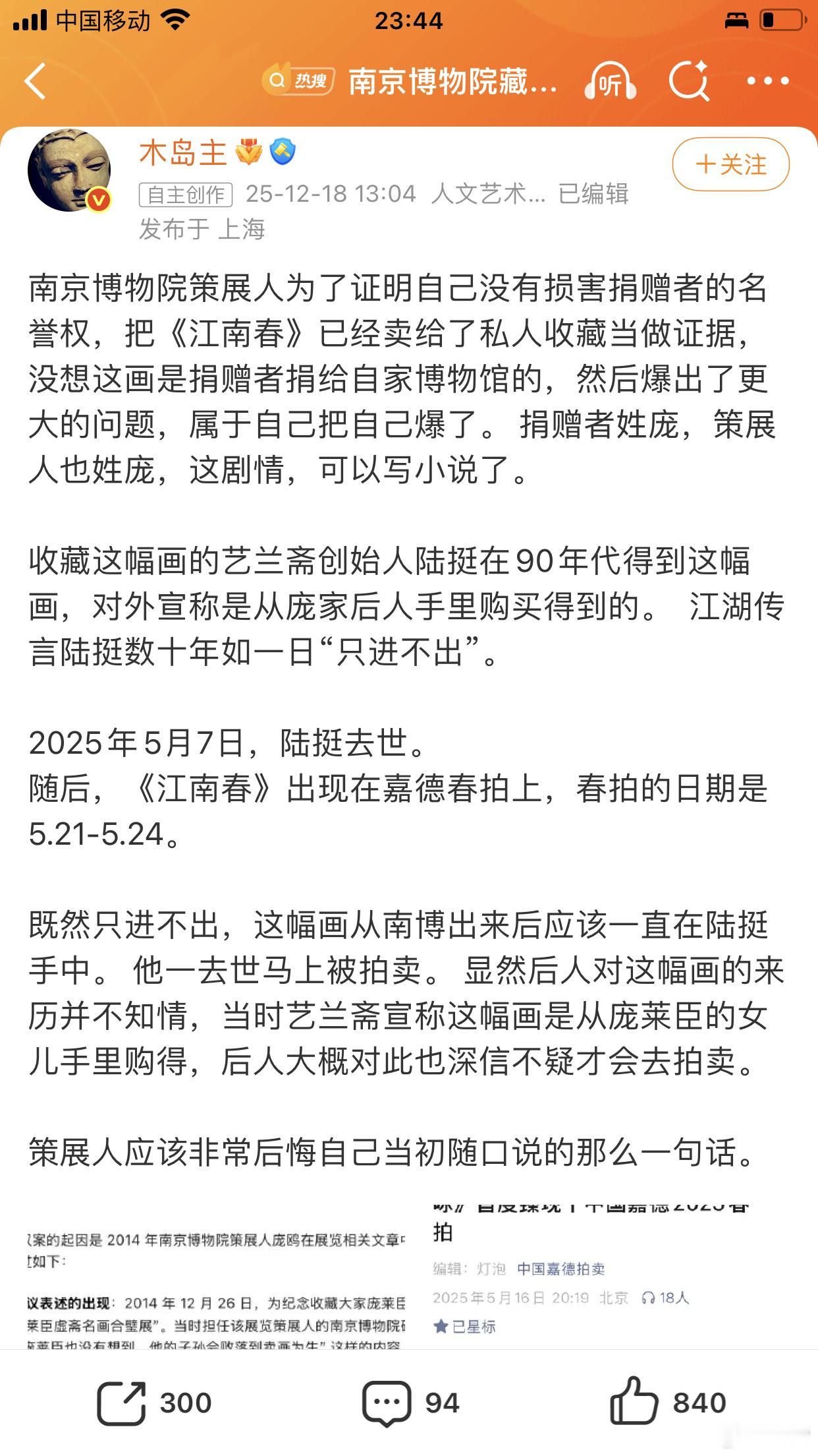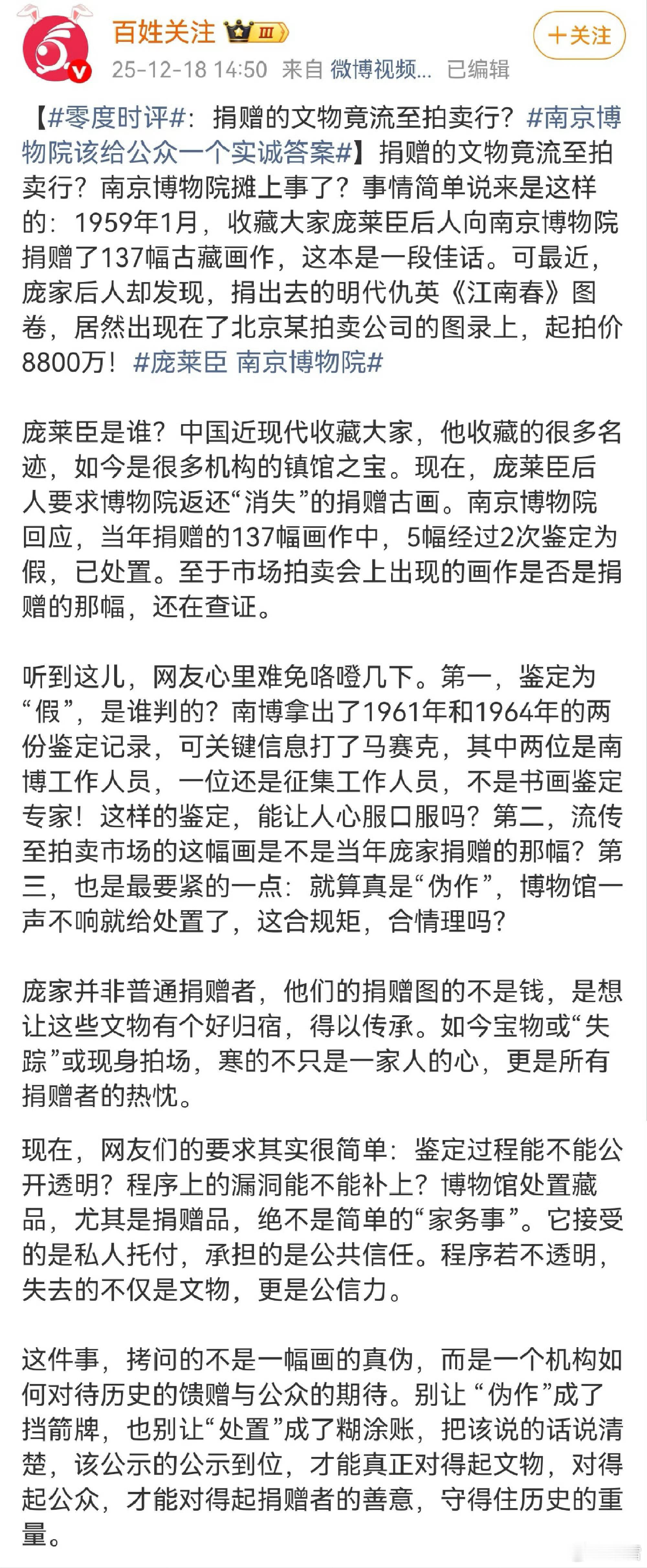 庞鸥———属于自己把自己爆了, 捐赠者姓庞,策展人也姓庞,这剧情,可以写小说了。 新浪热点:律师解读捐给南博藏品被拍卖【律师解读“捐给博物馆的藏品现身拍卖市场”:即使假文物馆方也无权自行处置,建议警方介入调查】律师谈假文物处置权 收藏家捐赠给南京博物院的画作《江南春》被指现身拍卖会,近日此事引发关注。12月17日,南京博物院发布情况说明称,经查,1959年1月,博物院正式接收庞增和先生捐赠的137幅庞家收藏画作。报道中提及的5幅争议画作,1961年经由张珩、韩慎先、谢稚柳组成的专家组鉴定为“伪”;1964年经由王敦化、徐沄秋、许莘农组成的专家组再次鉴定为“假”。上世纪90年代,博物院依照《博物馆藏品管理办法》对该5幅画作进行了处置。目前,该案件正在审理中。下一步,博物院将积极配合该案件审理,深入核查该5幅画作的去向,如果发现当年处置过程中存在违法违规行为,将配合有关部门依法依规严肃处理。同时,进一步加强对捐赠物品和馆藏文物的规范管理。关于拍卖市场出现的《江南春》图卷是否为受赠画作,尚待进一步查证。律师向记者表示,若该画作被认定为文物,无论真伪,博物馆无权单方面撤销赠与,自行处置;“公益展示、妥善保管”是博物馆的义务,如果其违背了该义务,赠与人有权撤销赠与,收回画作。律师建议,博物馆所在地的公安机关和所属纪检监察机关介入调查画作流失经过。(极目新闻)南京博物院 江南春