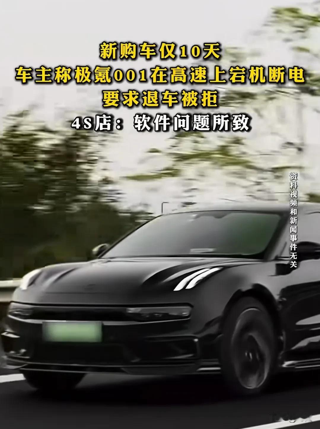 刚买10天的极氪001第一次上高速行驶中突发巨响,全车断电数分钟致车辆在高速车道停车,车主周女士强烈要求极氪给说法并退车,但是极氪方面表示车辆是软件故障已修复达不到退车的条件。 周女士于10月28日在昆明4S店购买了一辆新极氪001汽车,她表示花费25.48万元。11月8日晚上,周女士和丈夫王先生第一次驾驶新车开上高速,谁知在行驶中,车辆突然发出巨响,随后全车断电宕机,此时还在下雨,车辆被迫在高速车道停车,他们当时以为死定了,后车紧急制动差点撞上他们,情况十分危急。 数分钟后车辆才可以启动行驶,事后,周女士立即驾车返回昆明将车辆送至附近4S店进行维修。周女士认为车辆存在严重安全隐患,要求极氪提供事发时的行车记录仪器画面与相应行车数据,并退款退车。 但是极氪4S店方面称:行车记录仪数据已丢失,车辆故障属于中央娱乐屏软件问题,已升级修复,周女士的情况不符合“三包法”退车条件。目前双方还在因为此事进行协商,期间报警但是被告知民属于民事纠纷无法处理。 极氪001高速上巨响全车断电无法行驶 极氪车主称存在重大安全隐患要求退车被拒