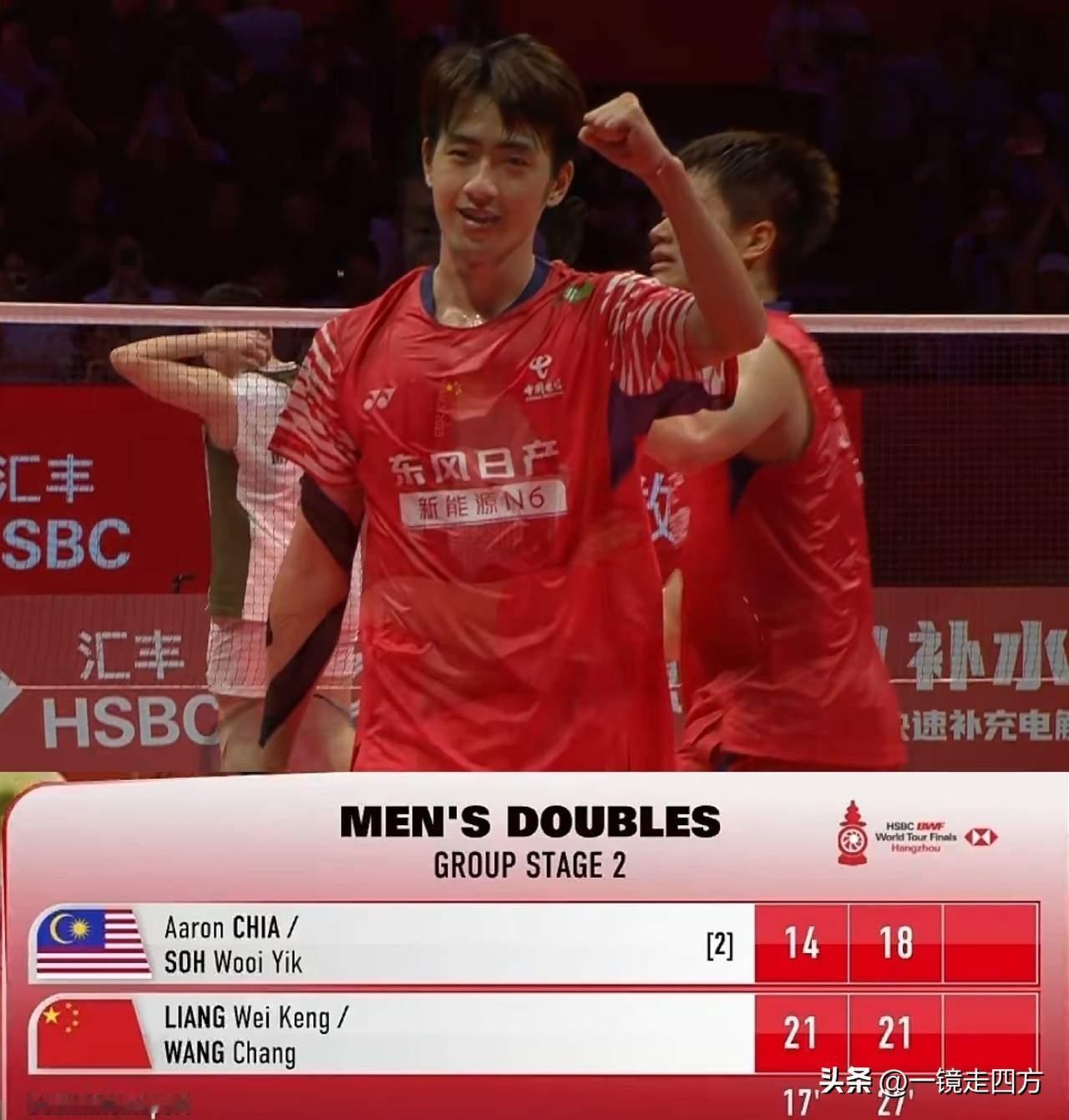 刚刚结束的一场世界羽联巡回赛年度总决赛男双小组赛第二轮比赛,首战失利的梁伟铿/王昶以21-14、21-18横扫马来西亚组合谢定峰/苏伟译,为自己保留了晋级四强的希望,明日将迎战印尼的双菲组合,两连败的谢定峰/苏伟译提前一轮出局。