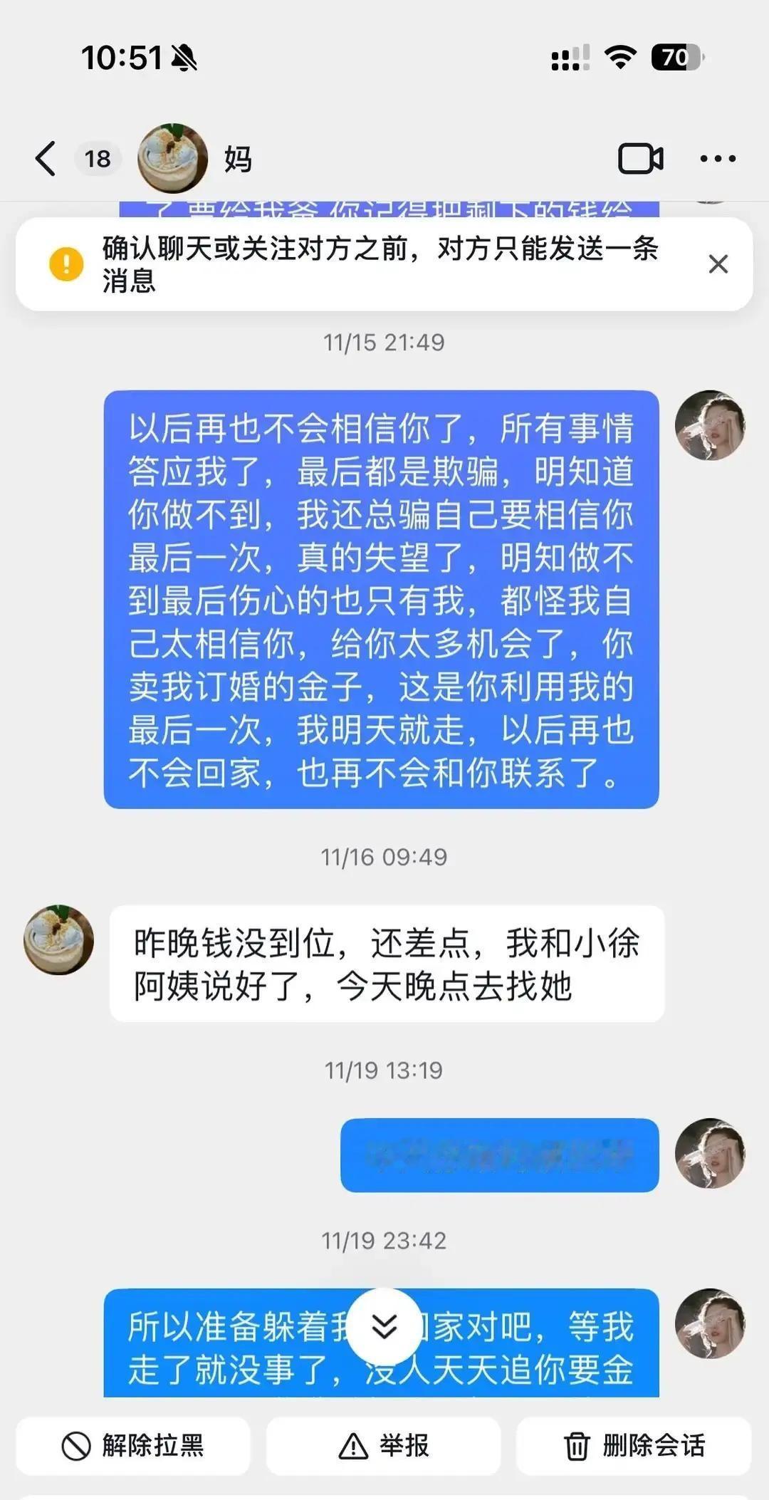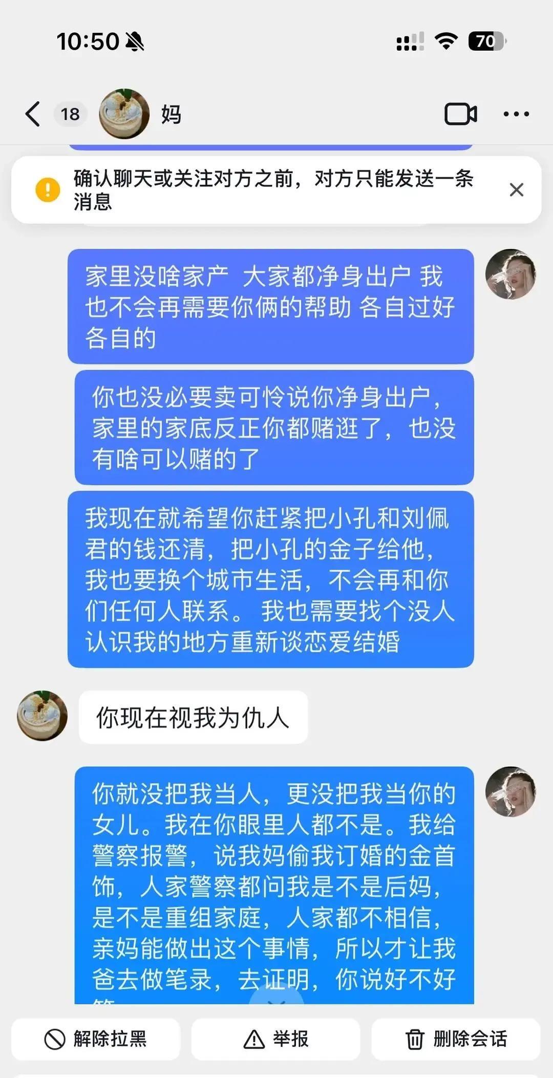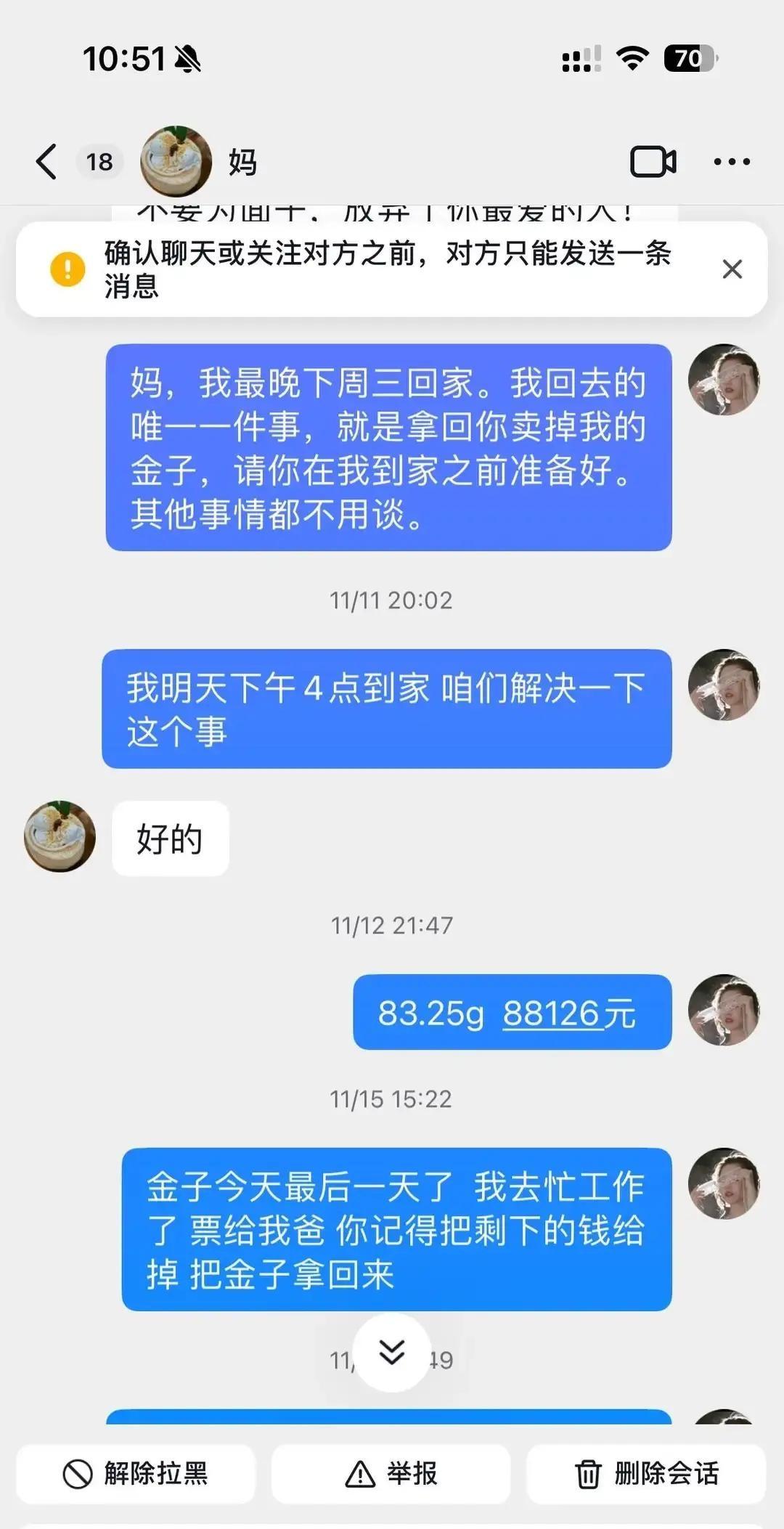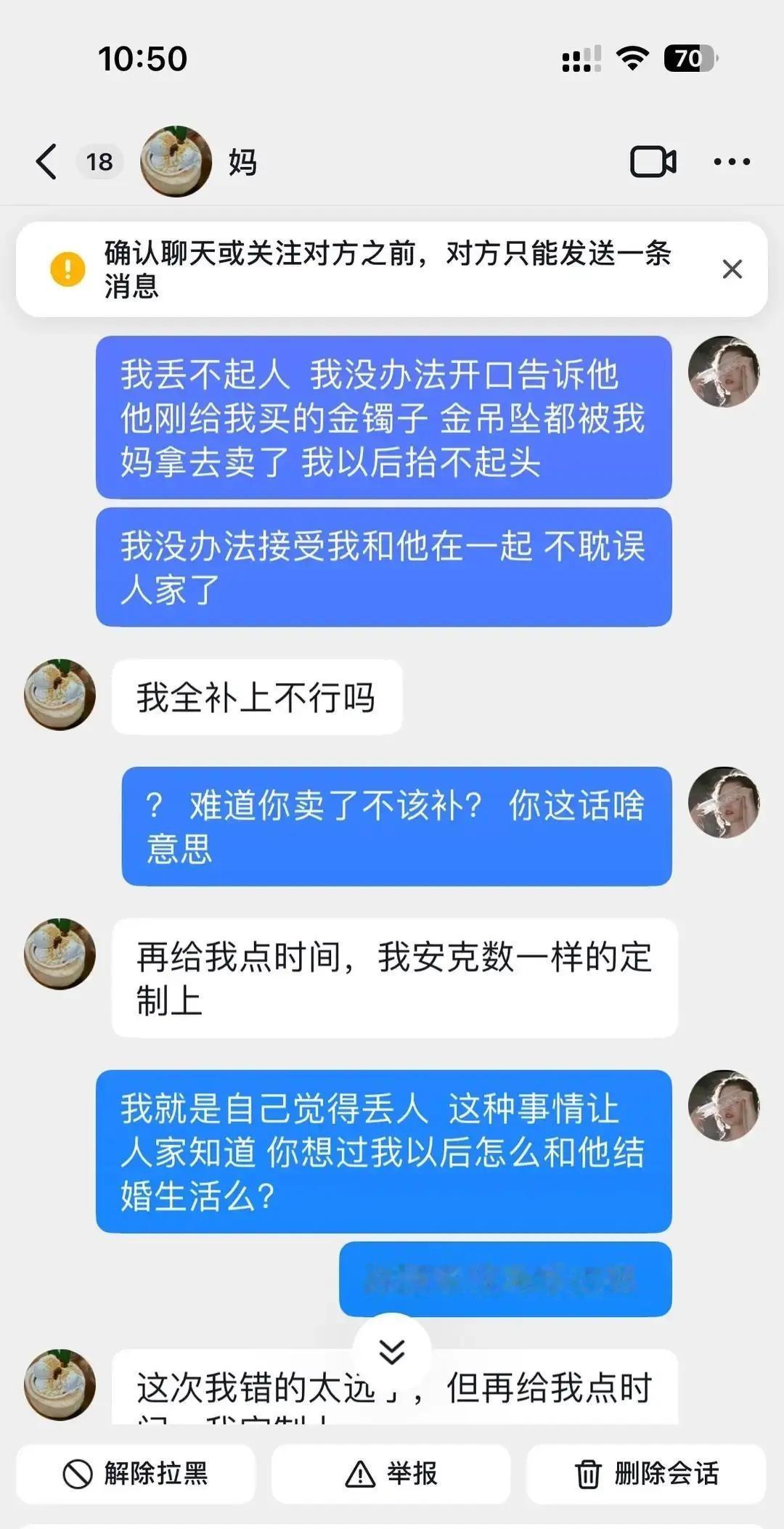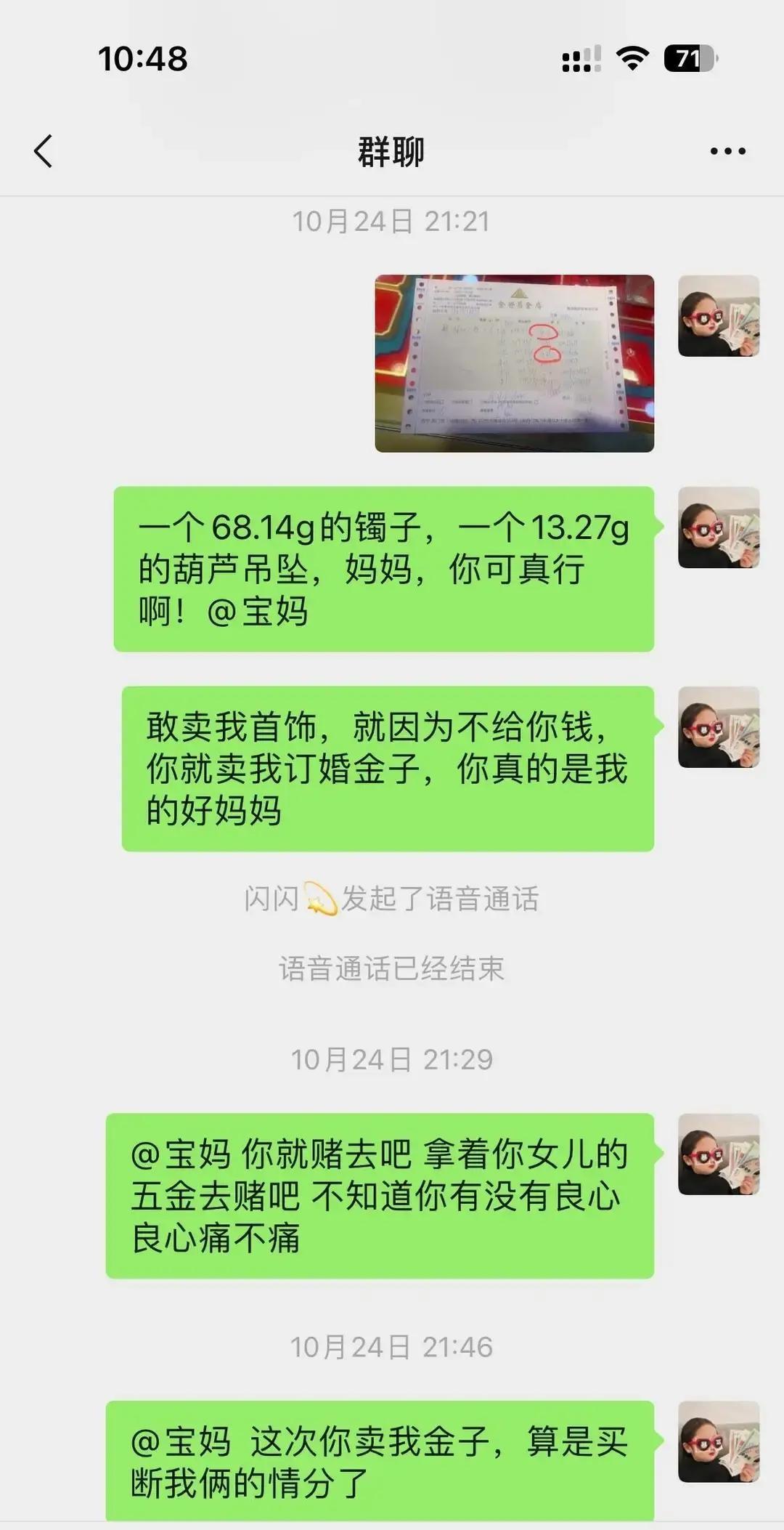 女生订婚刚收的80克五金被亲妈连夜拿去金店熔了卖钱,理由是要给弟弟用。 报警也立不了案,母亲关机消失三天,回来甩一句嫁出去的女儿泼出去的水。 她只好掏五万重新定做,还要跟男友演假分手逼家里赔钱,把全过程发上网。 评论区吵翻,有人骂她炒作,更多人喊干得好,说原生家庭把女儿当提款机就该曝光。 我看着都窒息,自己喜事被亲妈捅刀,重男轻女到连仪式都不留,换谁都要翻脸。 亲情不是免罪金牌,成年子女的财产就是私产,碰了就得还。 她敢撕破脸,是给所有被吸血的女孩打样。