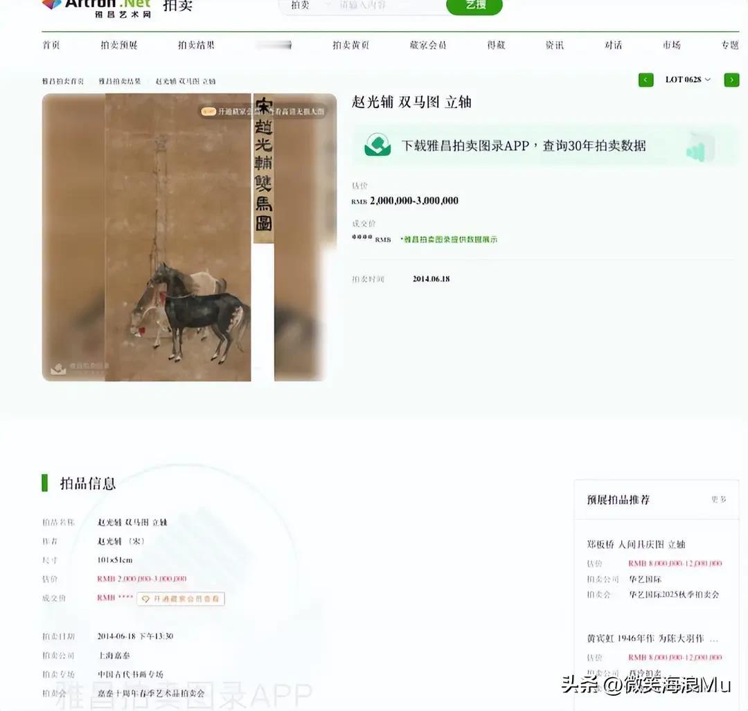 一位直系亲属在南京博物院工作的男士介绍,该院确实有一批蛀虫,从院领导一级到中层领导一级,再到具体工作人员、受益层很早就有了应对措施,把大部分事都推到死人身上,就是鬼来了也拿他们没办法。 南京博物院确有几任院长逝世了,中层也有的干部没了,就连保管员退休者死的死。他们想把活着的事件制造者、参与者、受益者,最后定性为仅仅是工作责任心不强,并不是有意而为之。 他们在这次事件的前后几年早就未雨绸缪了,众口一词会把主要责任推到死者身上。人死帐烂,神仙来了能咋样?这样事件最后才能不了了之。 可是只要真正查,是不会让活着的犯罪分子逍遥法外的。如果是工作失职,也可以按照严重失职造成极其重大损失和恶劣的国内国际影响来处理。 例如,仅仅几天江苏省文化和旅游厅调查组就对南京博物院说的第 2幅画作,查到了去向。 陆挺、丁蔚文夫妇在2009年发表的硕士论文中对《仇英〈江南春〉卷考辩》,写出了《江南春》是如何转到艺兰斋手上的。 南京博物院宣布所谓划拨调剂的 5 幅画作中: 分别为仇英的《江南春》 ; 赵光辅的《双马图立轴》 : 王绂的《松风萧寺图轴》 : 王时敏的《仿北苑山水轴》; 汤贻汾的《设色山水轴》。 应该说这些全是名家名画艺术大家,在中国艺术史上占有相当的地位,其作品流传有序。 真中第二幅画作赵光辅的《双马图立轴》,在2014年由上海嘉泰拍卖公司以230万元的成交价格拍出。从拍卖信息上可以看到,该幅图题签为“宋赵光辅双马图,画作上有钤印,分别为庞元济印(白)、莱臣眼福(朱),其中庞元济就是庞莱臣本人。(见文底照片),都能证明这些画是真的。 有许多网友建议在调查期间,消防部门应该加强对南京博物院的防火预防工作,千万不要让 “ 热锅上的蚂蚁 ” 策划一把大火烧啦!南京博物院的公信力次,已经到了这个角这个层次。 关心的读者和有专业知识的网友都知道,收藏家收藏画作,只有对正品才会加上自己的印鉴。表示一种承认与责任,同时也是对受邀的尊重和回应。 被拍卖的 5幅画作上,都有明显的收藏家印鉴。仅凭南京博物院自己说是假的就是假的吗,南京博物院找来的那三位鉴定专家,有的笔迹明显是模仿签上去的,有的已经不在了。目前证据链太假,根本不能令人信服。 这么年出土的文物,民间人士、公益人士、收藏大家捐赠给博物馆的文物,多少还在?有多少已经不在了? 66年前由收藏家无偿捐赠给南京博物院的明代大家仇英的《江南春》流入拍卖市场,被收藏家后人发现经上级工作撤拍,这打了谁的脸? 一位名叫钉珠漫长的作者介绍,她联系了在文博系统的同学,介绍了此类工作流程:入藏要建卡,编号、印鉴、照片一套,出库必须有签报,借展要有合同和保险押金并严格逐级审批,一般不外借。文物层层留痕,理论上不存在丢失可能,除非人为设计的有意而为之。 南京博物馆是怎样把庞家捐赠的国宝级画作弄丢的呢?需要瞒天过海的本领。制造档案混乱外借后不重新回库; 有意登记错误,复制件留馆,真迹被混走带出; 其中有拍卖图录显示,画作尺幅、题跋、钤印与图录绢本纵横尺寸和公开资料略有差异2厘米。 捐赠协议写有 “不得转让、不得自行处置”,那么是谁专挑关健时刻为画作离院给予默许和放行?查实离院签字者是谁? 南京博物院以逝去那几位院长或中层干部,并模仿签字笔迹,这样会增加麻烦但也能查实。 作为“ 吴门四家 ”之一明代仇英的《江南春》流传十分有序,只是因为它的艺术价值和经济价值最高,南京博物院才有人动了心思,千方百计把它弄成假的,为最后弄到手打下基础。 经过查证清代的时候,这卷画先在王氏话雨楼,再到苏州过云楼,被《过云楼书画记》称为仇画第一,流传到庞莱臣手里时,被业界评价为 “虚斋至精之品。”有仇英的亲笔名,你们想法把它弄成假的,你们心里不感到心虚吗? 南博物院监守自盗胆大包天,邀请所谓三个鉴定者进行假鉴定罪加一等。 更缺德的是南京博物院有的人挖苦心思造舆论,为的是把画说成假的才方便获利。明明是无偿捐赠,却在文章中写道:“庞莱臣也没有想到,他的子孙会败落到卖画为生。” 对捐赠者的儿子、孙子进行了严重的人格侮辱,真是良心被狗吃了。经过法院审判南博输得连内裤都没有了。 北京预展 《江南春》图录介绍与庞家当年卷记完全一样,6位国家级专家学者看过现场录像说:就是真品,他们评估正式开拍时《江南春》会轻松突破1.5亿元,再往上升就要看临场竞价。 在与南京博物院的博弈中庞令和是弱者,将鉴定材料打上马赛克,南愽你们自己能相信吗?该事件已经形成重大社会舆情外国也有报道,不了了之将影响我国声誉和社会稳定。 上述内容是笔者在