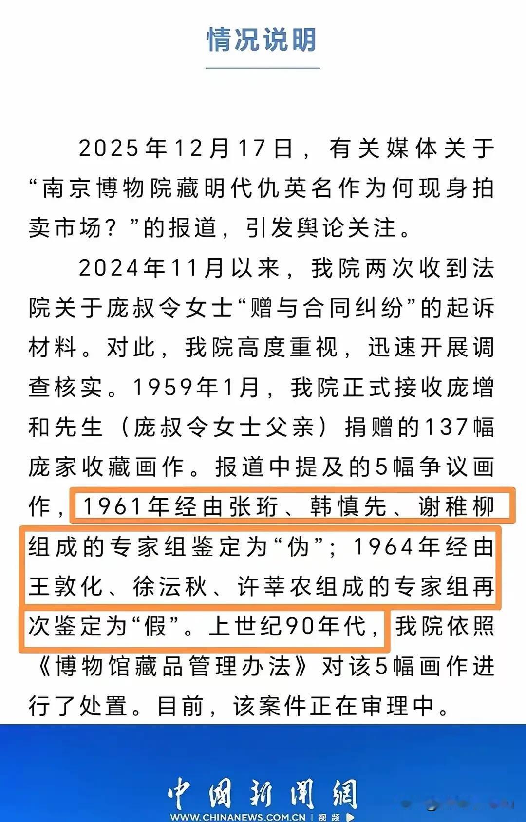 南京博物院对宠家捐赠的明代著名画家、“吴门四家 ”之一仇英《江南春》的回应上似乎撒了弥天大谎? 为了把《江南春》剔除,当时的南京博物院院领导层挖苦心思,于是想出先鉴定为赝品,后就好处理了的办法。可是他们恰恰有意忽视,干脆不按照起码的规定和常识:应该通知捐赠者本人或子女。 收藏仇英《江南春》图卷的南京藏家已于今年5月去世,当地收藏家协会已对此回应确认。所以才会出现在拍卖会上,这是南京博物院领导亲手导演的?还是他们心知肚明的?笔者没有根据,无法承担法律责任不可以乱说。 笔者朋友的亲属在南京博物院工作,他知道一些内情。南京博物院馆藏名画现身拍卖市场,是因为《江南春》图卷上世纪九十年代被南京艺兰斋陆挺夫妇购得。 陆挺先生已经在5月份去世,江苏省收藏家协会5月9日专门发表哀悼陆挺的文章说:陆挺是中国著名的古籍收藏家、艺兰斋董事长、江苏省收藏家协会书画收藏委员会顾问,“2004年9月,他成功将二百五十枚流失日本的国宝秦代封泥购回国内。同年底,又斥资一千万元人民币,从香港佳士得拍卖行竞得明代仇英的《仙弈图卷》。” 2006年南方周末曾在报道《爱画及屋的“偏执狂》中称,正在筹建艺兰斋美术馆的陆挺收藏了上万件文物,“其中元明清书画珍品3000余件,包括明仇英的《江南春》手卷在内的国宝级文物有数十件。” 我朋友的亲戚说:陆挺先生有很强的爱国心和很高的文化艺术造诣,在收藏《江南春》时慎之又慎。有多位国家著名专家学者帮助验证《江南春》真品无疑。否则,绝不会斥巨资收藏。 而南京博物院的回应中却说,5幅争议画作,1961年经由张珩、韩慎先、谢稚柳组成的专家组鉴定为“伪”,1964年经由王敦化、徐沄秋、许莘农组成的专家组再次鉴定为“假”。 在南京博物院工作的这位我朋友的亲属,是位有学专业学历的工作人员,他有一定的辨识能力有学术成果。南京博物院提供的所谓鉴定专家,有的已经不在世了,其签字笔迹当时就有异议说是别人模仿的? 上述重大社会新闻是笔者在 征文栏目发表的。 星途双车的性价比高,安全保障好。征文活动开展以来销量正在上升,价格相对便宜,工薪族购车不吃力。 星途双车限时好价