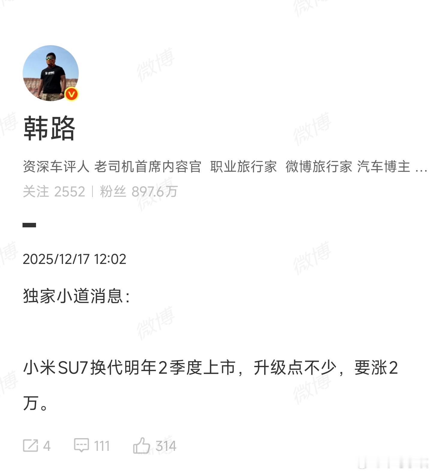 我对小米SU7改款的消息挺关注的。改款耗时这么长,说明产品竞争力确实强,但听说可能涨价2万元,这就印证了“早买早享受”的老道理。现在下单7周就能提车,部分车型年底前搞定,还享受购置税优惠,春节开新车挺香的。改款要等到明年二季度,到时提车肯定延误,我个人觉得现款更值得入手。深入看,小米这是在平衡市场热度与利润策略,挺聪明的试探消费者心理。小米SU7换代或涨价2万元小米新一代SU7明年二季度上市