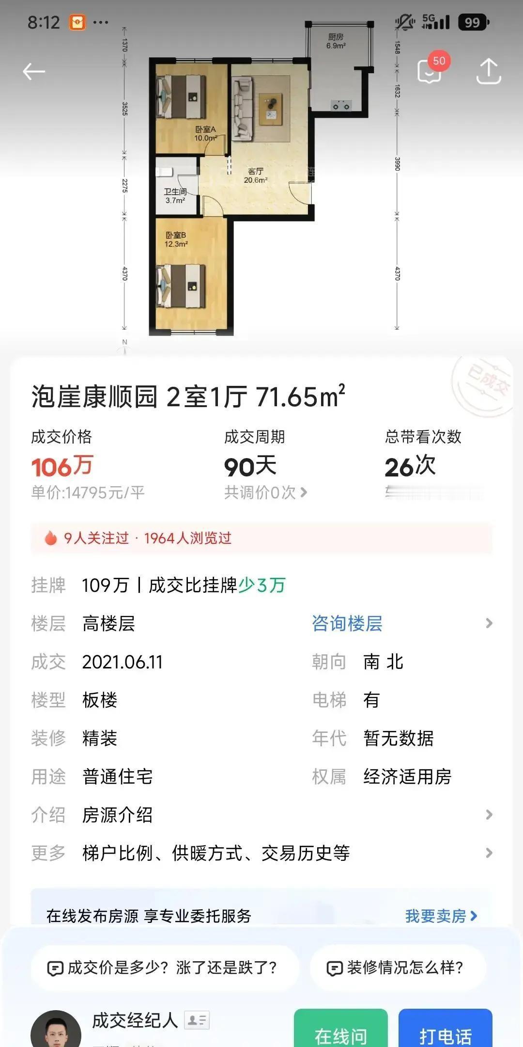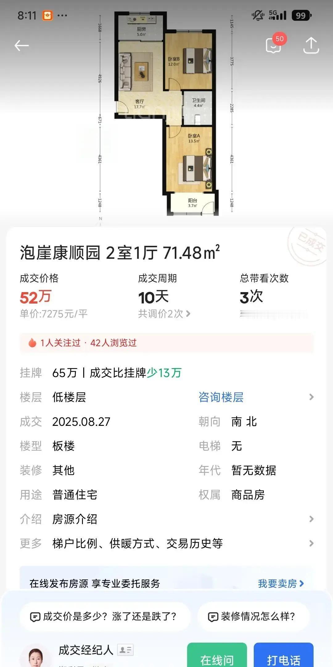 大连泡崖子康顺园一套70平老房36万成交,单价直接跌到五千一,刷到中介朋友圈我都不敢信。 两年前同户型还要七千多,五年前的挂牌价更夸张,八千往上,现在直接腰斩。 房龄老、没电梯、物业凑合,学区也一般,买家图的就是离地铁不算远,首付十万就能在主城区落个脚。 卖家急着换房,挂三个月没人问,一咬牙降到底,终于把“烫手山芋”甩出去。 评论区全是“房子真成消费品”“老破小别再幻想升值”,看得我心里咯噔,当年谁要是高位接盘,现在账面亏掉一辆代步车。 统计局说大连二手房价连跌二十八个月,这回个案算是把遮羞布彻底扯下,数字再冷,也抵不过真实成交的一记耳光。 房子回到居住本身,涨跌都别赌,量力而行才睡得踏实。