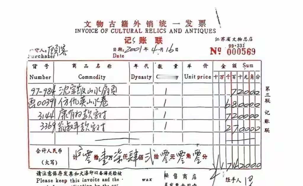 仇英《江南春》售出票据被曝光,2001年6月被人以6800元买走,销售清单写着“仿仇英山水卷”。 而在1997年5月,南博有批不够馆藏标准的书画交给原江苏省文物总店,在1259件剔除品中就有被他们鉴定为赝品、“不宜入藏”的《江南春》。 至于两次专家鉴定,1961年那次,经张珩、韩慎先、谢稚柳三位专家鉴定,结论是: “江南春图卷,伪,一般,陈鎏提引首真,后面题跋完全不对,伪做得很好,原庞家是当真藏的。” 1964年王敦化、徐沄秋、许莘农三位专家复鉴,结论是: “仇英江南春图卷,假。” 现在原主庞莱臣和新主陆挺都已过世,但画还在,好奇会不会来第三次专家组鉴宝,看看这幅画怎么就预估拍价能到8800万。