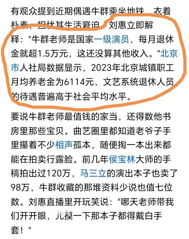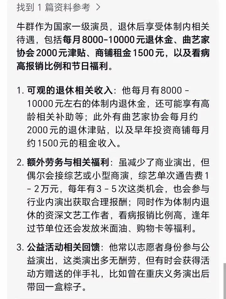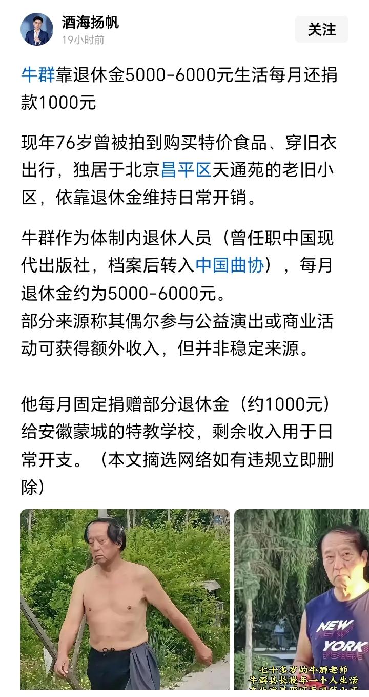 牛群穷困潦倒,每个月只有5、6000退休工资,还每月捐款1000元给蒙城特教学校? 这是我看到的一篇文章,说著名相声演员牛群退休了,日子过得紧巴,仅靠每个月靠5、6000一个月的退休工资生活,而且他还捐款1000元给蒙城特教学校。因为他以前挂职过蒙城县当过副县长! 还说他现在住在北京天通苑小区,这个小区是个北京很普通的居民小区。 我看到这篇文章,第一感觉就是假的! 我特地查了一下,果然不对。牛群是国家一级演员,退休工资绝对不止5-6000,网上说是8000-10000,相声演员刘惠说他最少每个月15000元。 牛群之所以看起来不修边幅,邋遢。其实与他性格有关。 他早年和冯巩搭档,确实是很红。但是他“发神经”一样,突然去当副县长,把冯巩丢一边,让冯巩很为难。当县长以后,又玩起了摄影,还开过摄影展,但是都没搞出大名堂。 再后来,他又想回来说相声,网上的消息说他求冯巩,但是冯巩已经不搭理他了。当时我在做记者,我还记得当时媒体报道过,两个人之间好像有一些“过节”。 再后来冯巩已经是曲协的领导,牛群性格又大大咧咧,再也没赶上趟,两个人再也没合作。 牛群退休后可能日子过得普通,但说他贫困潦倒,我是不信的!