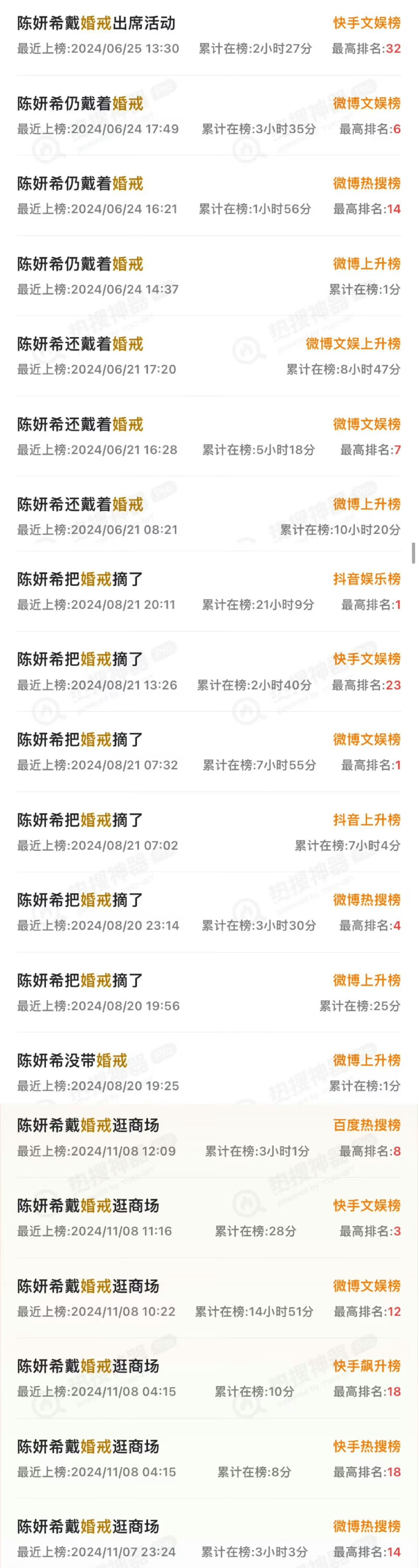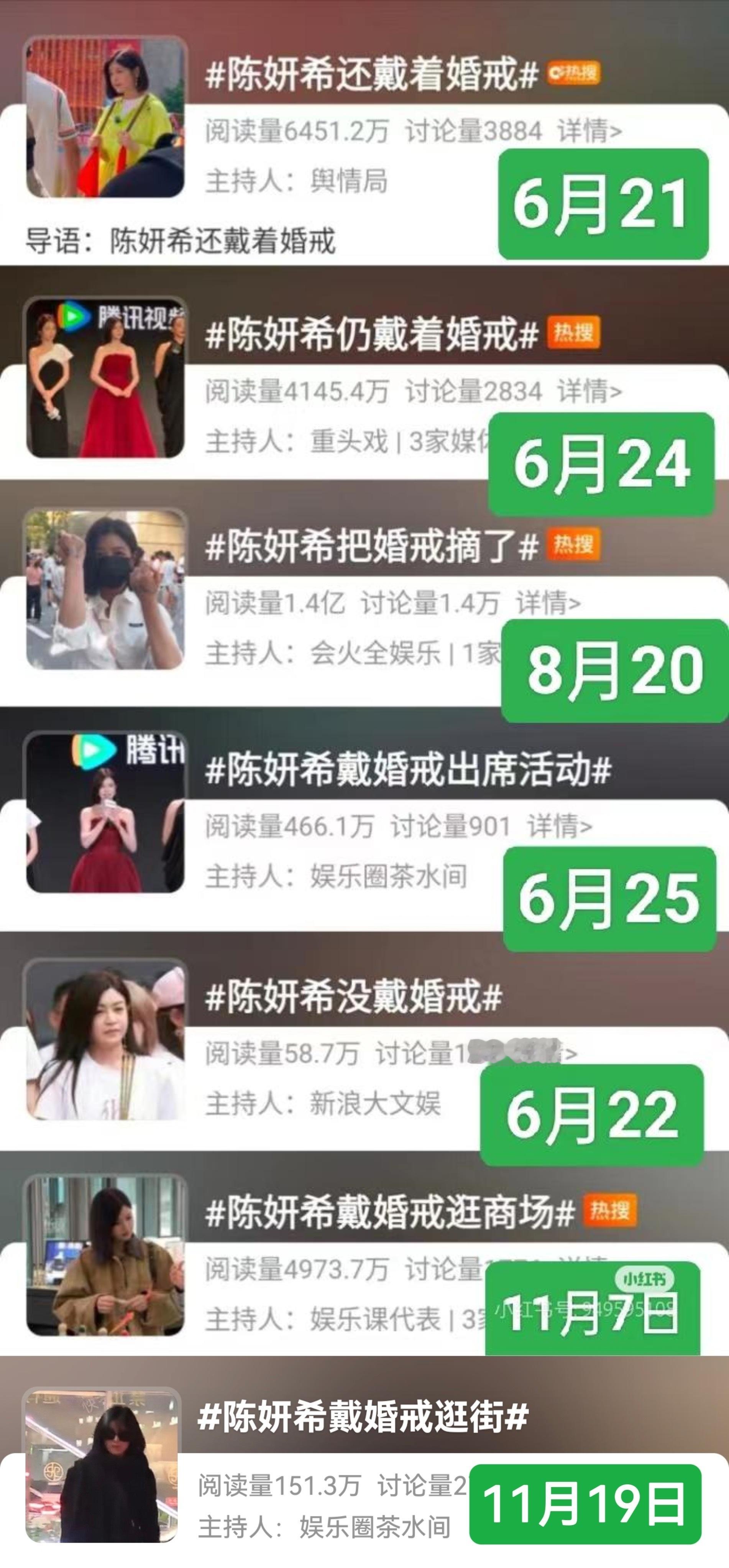 有网友统计了陈晓陈妍希离婚后,关于陈妍希戴戒指的热搜,真是多啊!