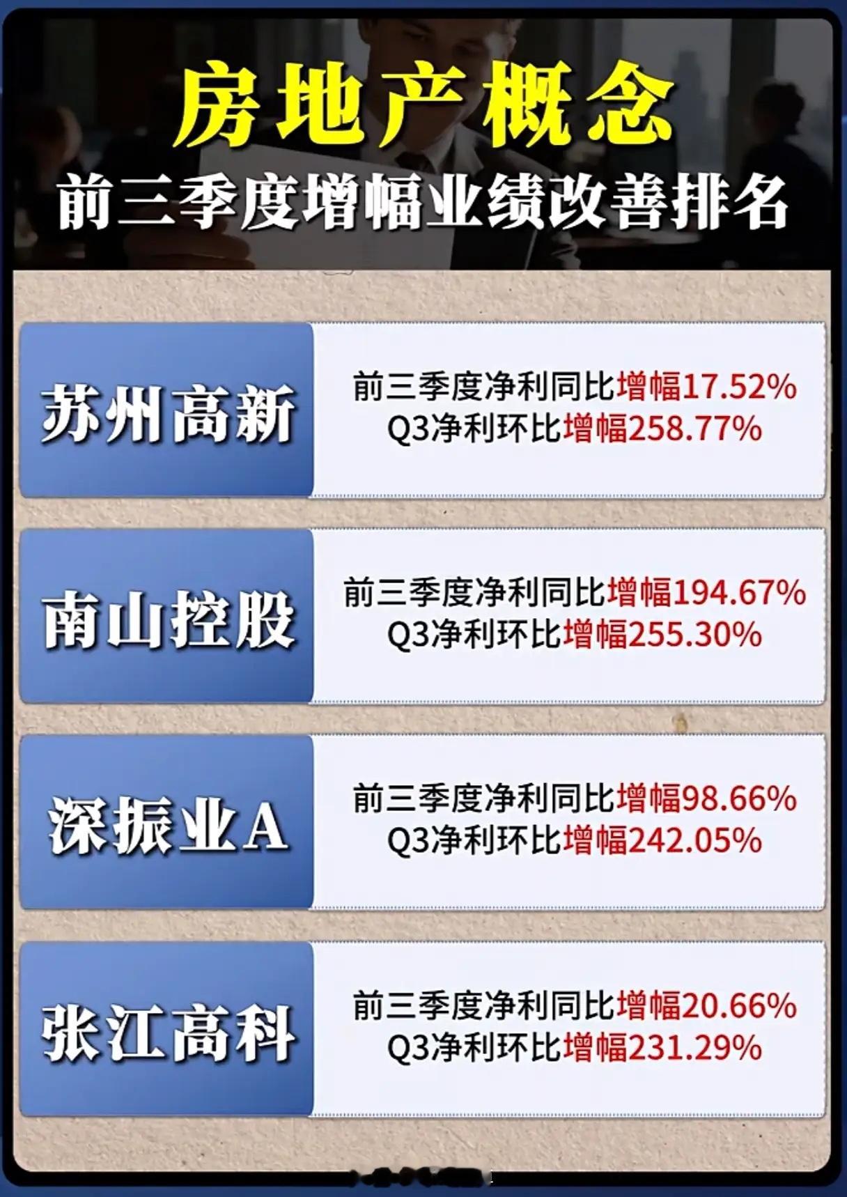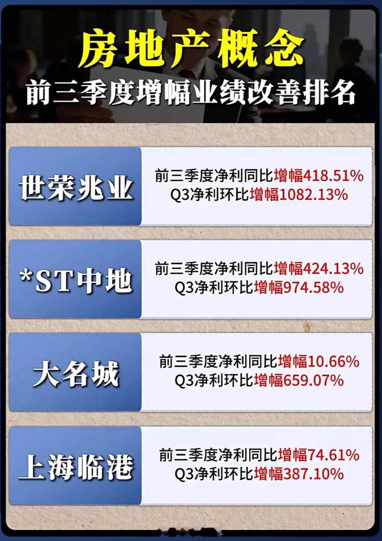 房企业绩逆袭榜出炉,政策松绑下谁抓住了翻盘机会?当*ST中地前三季净利同比增幅达424.13%,世荣兆业Q3净利环比激增1082.13%,2025年前三季度房企业绩改善榜单的亮眼数据,并非单纯的行业回暖,而是政策松绑+区域布局+业务转型的三重结果,也折射出房地产行业从“规模扩张”向“质效提升”转型的核心逻辑。政策红利成为房企业绩反弹的关键推手,2025年国内楼市“认房不认贷”“降低首付比例”等政策持续加码,核心城市二手房交易税费减免、房企融资“三支箭”扩容,让房企的资金压力与销售端均迎来改善。*ST中地凭借债务重组与政策支持实现扭亏,前三季净利同比增幅424.13%;世荣兆业受益于珠海本地楼市政策松绑,Q3净利环比增幅超10倍,区域市场的销售回暖直接带动业绩飙升。区域布局的优势让房企收获差异化增长,苏州高新依托长三角核心城市的区位优势,前三季净利同比增17.52%,Q3环比增幅258.77%,园区开发与地产销售的协同效应凸显;南山控股聚焦粤港澳大湾区的产业地产,前三季净利同比增194.67%,产业园区的租金收入成为业绩稳定器;上海临港则凭借临港新区的政策倾斜,科创地产的营收占比提升至40%,74.61%的净利同比增幅体现了产业地产的价值。业务转型的成效进一步放大业绩弹性,张江高科从传统地产转向科创孵化,科创企业孵化服务收入占比超50%,前三季净利同比增20.66%;深振业A通过存量资产盘活与城市更新项目,Q3净利环比增幅242.05%,资产运营效率的提升成为业绩增长的核心;大名城虽前三季净利同比仅增10.66%,但通过优化项目开发节奏,Q3净利环比增幅659.07%,精细化运营让企业实现业绩逆袭。房地产行业的业绩分化,本质是“政策适配+自身实力”的双重筛选。*ST中地、世荣兆业等企业凭借政策红利与区域优势实现业绩反弹,张江高科、上海临港则靠业务转型打开增长空间。随着楼市政策的持续优化,具备区域布局优势与转型能力的房企,将在行业调整中占据主动,而房地产行业的发展也将从“普涨时代”进入“分化提质”的新阶段。
