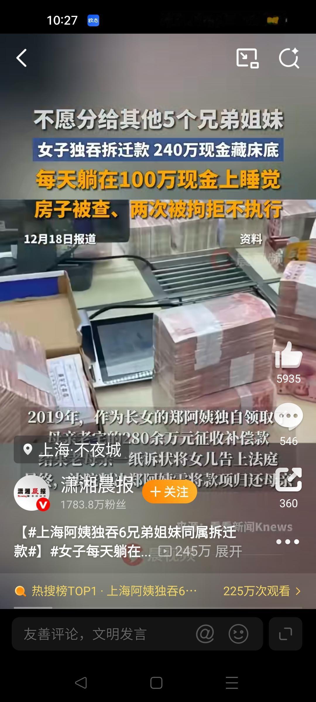天呐,这事儿听起来就够让人惊掉下巴的! 2019年,郑阿姨作为家中长女,户口落在母亲老宅。老宅被征收后,她独自领取了280余万元补偿款,母亲遂将其诉至法庭。2019年那次老宅征收,本应是一家人共享喜悦的时刻,可郑阿姨却独自把280余万元补偿款揣进了自己兜里。母亲一看这情况,那能乐意吗?直接就把她告上了法庭。 这一告可就把家里的矛盾彻底激化了。其他6个兄弟姐妹也炸了锅,纷纷指责郑阿姨太自私。大家聚在一起讨论这事儿的时候,场面那叫一个混乱。有人说:“都是一母同胞,怎么能做出这种事呢!”也有人劝着要冷静处理,毕竟是一家人。 郑阿姨呢,却觉得自己有理。她觉得自己户口在老宅,这笔钱就该归她。她还气呼呼地说:“这么多年我照顾母亲也不容易,这点钱就当是补偿了。”可其他兄弟姐妹不这么想啊,他们觉得母亲的赡养大家都有份,不能因为户口的事儿就独吞拆迁款。 随着法庭审理的推进,矛盾越来越尖锐。一家人原本的亲情在金钱面前变得脆弱不堪。大家从最初的争吵,到后来见面都不说话,关系降到了冰点。 最后,法庭会怎么判呢?这笔拆迁款到底该怎么分呢?是亲情能战胜金钱,还是金钱会彻底击垮亲情?这真是个让人深思的问题。大家说说,如果你遇到这种情况,觉得这拆迁款该怎么处理才合适呢?社会百态 社会新闻