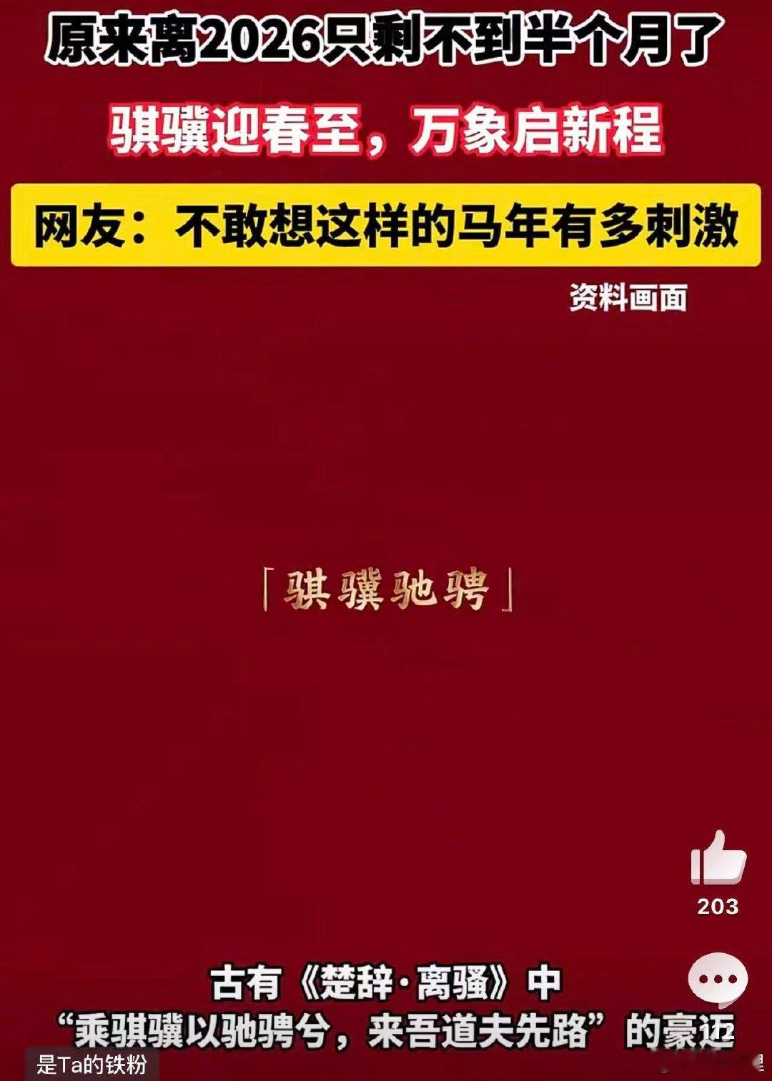 原来离2026只剩不到半个月了时光疾行,距2026马年不足半月!承《离骚》骐骥驰骋之姿,携一马当先的果敢、马到成功的期许,新岁热血已就位,静待奔赴崭新征程~