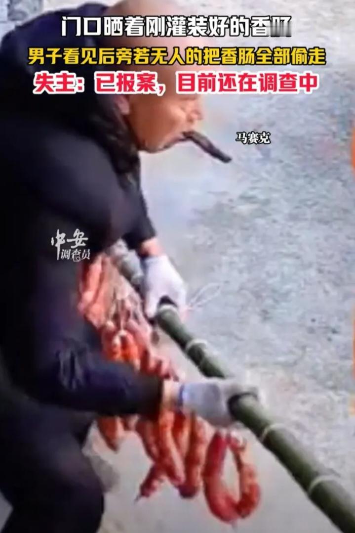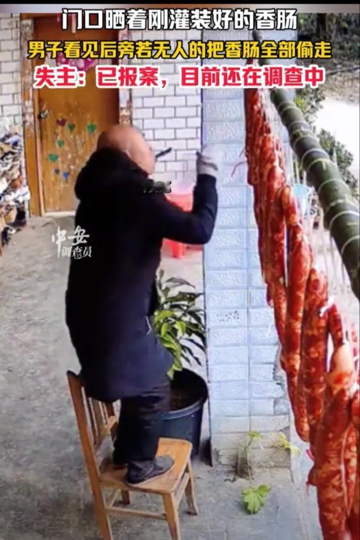 必须严惩!四川成都,一女子将新灌好的香肠放在家门口晾晒,万万没想到,还不到24小时,香肠一根不剩全被人偷走了,查询监控后,女子也是被气的够呛,一名陌生男子竟然直接把晾晒杆给卸下来,叼着烟旁若无人的把香肠拿走了。 监控显示,一名陌生男子大摇大摆走过来,手里还叼着根烟。他先是从旁边搬了个凳子,站上去,很利索地把晾香肠的杆子整个卸了下来。那架势太熟练了,不知道的,还以为是在收拾自家的东西。他也没多停留,扛着一整杆香肠,转身就走了。 女子说,这些香肠是前一天下午才灌好的,新鲜猪肉灌的,本是备着的年货。第二天上午发现没了,心里特别不是滋味。她已经报了警,事情正在处理中。监控拍得清楚,找到人估计不难。 但这事儿让人越想越不是味儿。你说偷东西的人,差那一口吃的吗?恐怕也不是。就是觉得顺手,没人看见,就拿了。可这一拿,丢的不只是香肠,更是做人的分寸。尤其是在年底,大家忙忙碌碌准备过年,这种占小便宜的行为,特别伤人心。我觉得报警是对的。不是为了那几斤肉,而是这事不能被当成小事混过去。 很多人总觉得这种事不值得较真,丢了就算了,可一旦大家都选择算了,胆子大的就会越来越大胆。今天敢卸你家晾晒杆,明天就敢动别的东西。为了一杆香肠,背上个偷窃的名声,实在不值得。左邻右舍一旦知道,以后抬头不见低头见,这脸往哪儿搁? 人活一张脸,树活一张皮,这话真不是白说的。这男的光天化日之下偷香肠,监控拍得明明白白,警察找上门是早晚的事。真等东窗事发,街坊邻居指指点点,他还好意思在这片儿溜达吗?谁家过年不置办点年货,那香肠是人家女子辛辛苦苦灌的,里头全是过年的盼头,就这么被他扛走了,换谁谁不膈应。 更可气的是他那熟练的架势,保不齐不是头一回干这种缺德事。这种人就是抱着侥幸心理,觉得拿点小东西不算啥,殊不知小便宜占多了,早晚要栽大跟头。偷的是香肠,丢的是人品,为了这点吃的,把一辈子的脸面都扔了,简直糊涂透顶。 各位读者你们怎么看?欢迎在评论区讨论。