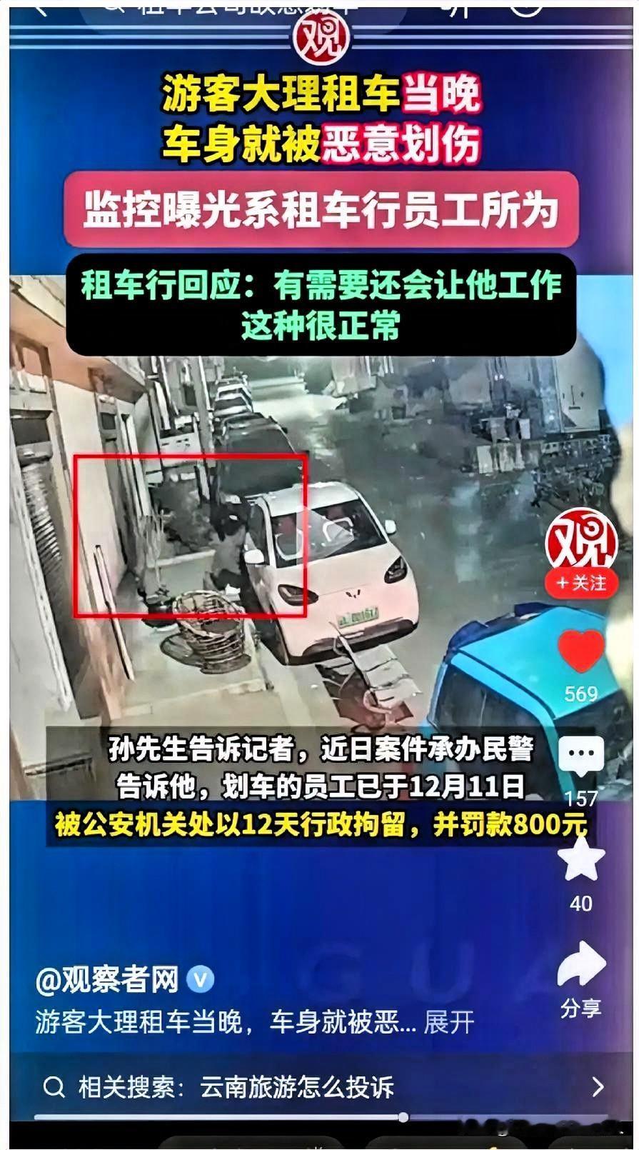 谁懂啊!这糟心事! 游客在大理租车游玩,当天晚上停在酒店门口,车身就被人恶意划伤。报警后,调取监控,发现划车的竟然是租车行员工。 游客刚租的车,白天开着还好好的,晚上停在酒店门口,第二天一早发现车身多了好几道深划痕,明显是被人恶意划的!这不明摆着要坑钱吗?游客当场报警,民警调了酒店监控一查,所有人都惊了——划车的不是别人,竟然是租车行的员工! 警方通报很快就来了:这名员工恶意损坏他人财物,情节严重,直接被拘留11天,还罚了800块! 这事越想越气,租车行简直太黑心了!明摆着是想等游客还车时,栽赃让游客赔钱敲诈。就算这事不是老板指使的,租车行管理混乱、纵容员工作恶,也难辞其咎! 更让人膈应的是,这种缺德事严重抹黑了大理的旅游形象! 多少人冲着云南的好山好水去的,结果被这种无良商家败坏心情。必须呼吁文旅部门严查到底,把这家黑心租车行曝光,直接停业整顿,别再让它坑害其他游客! 严惩涉事员工只是第一步,深挖租车行的管理责任、筑牢行业监管的防线,才能实实在在护好咱们游客的权益! 家人们,这事你们怎么看?是该直接关停这家黑心租车行,还是加强行业监管杜绝后患?评论区等你们的硬核观点!