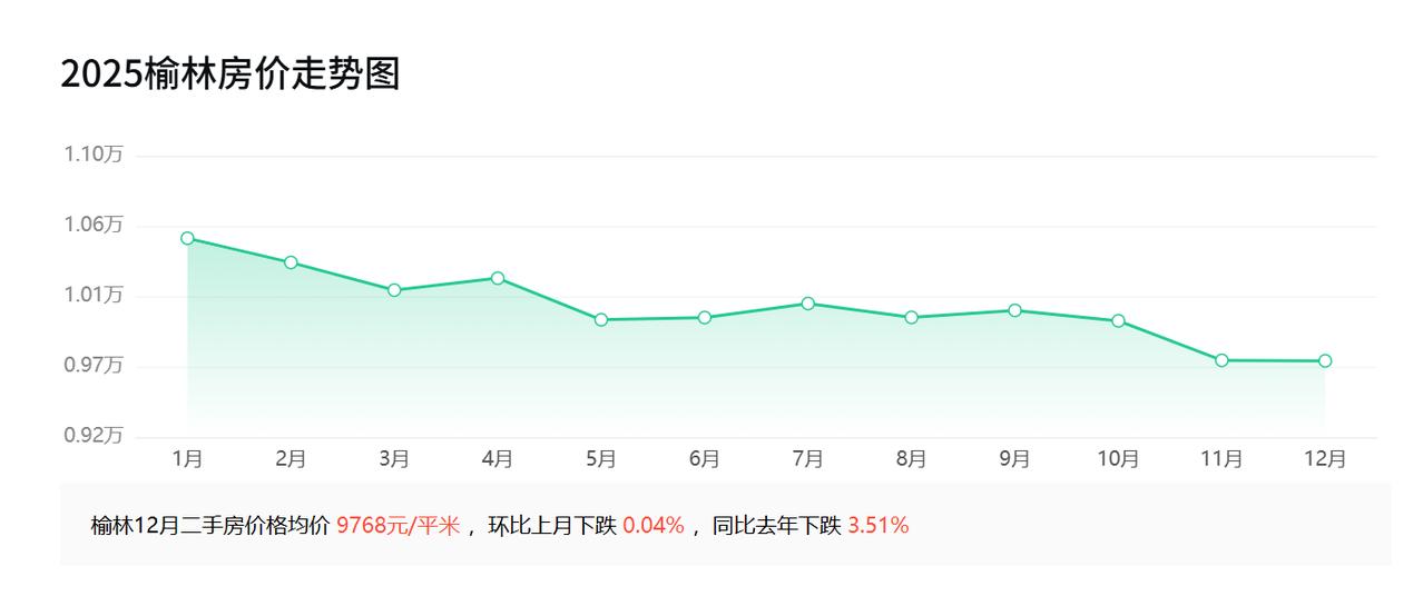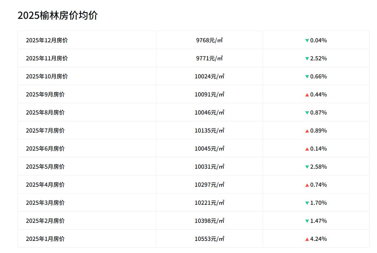 2016年11月,榆林房价均价5982元; 2017年11月,榆林房价均价6143元; 2018年11月,榆林房价均价6229元; 2019年11月,榆林房价均价7103元; 2020年11月,榆林房价均价7905元; 2021年11月,榆林房价均价9596元; 2022年11月,榆林房价均价11244元; 2023年11月,榆林房价均价12391元; 2024年11月,榆林房价均价9799元; 2025年11月,榆林房价均价9771元。   回顾榆林十年的房价,2025年11月的9771元相比2016年11月的5982元,上涨了3789元,降幅达63.34%。相比2025年1月的10553元,下降了782元,环比2025年10月的10024元,下降了253元。 2025年前三季度,榆林GDP达5654.11亿元,排名全国第42位,略低于江西南昌、浙江嘉兴,略高于江苏泰州、浙江金华,全国排名明显下滑。 截至2024年末,榆林常住人口361.65万人,出生率7.8‰,死亡率7.15‰,自然增长率0.65‰。城镇人口233.19万人,占64.48%;乡村人口128.46万人,占35.52%。 榆林房价2025年11月比2025年1月下降了782元,下降幅度不小,价格基本上回归到2021水平。不过也得看区域,核心区域的房价不降反增,远郊地区房价下跌明显,拉低了整体平均价格。  那么,在刚刚过去的11月份,大家对榆林的楼市有什么切身的体会,咱们在评论区聊一聊。  数据说明:以上均价数据,引用自安居客,仅作为分析参考,旨在反映榆林近十年的房价走势,不能准确映射当地实际房产价格。因为新房、二手房、不同区域不同位置的房价差别较大,占比也不同,仅通过一个均价不能一概而论。