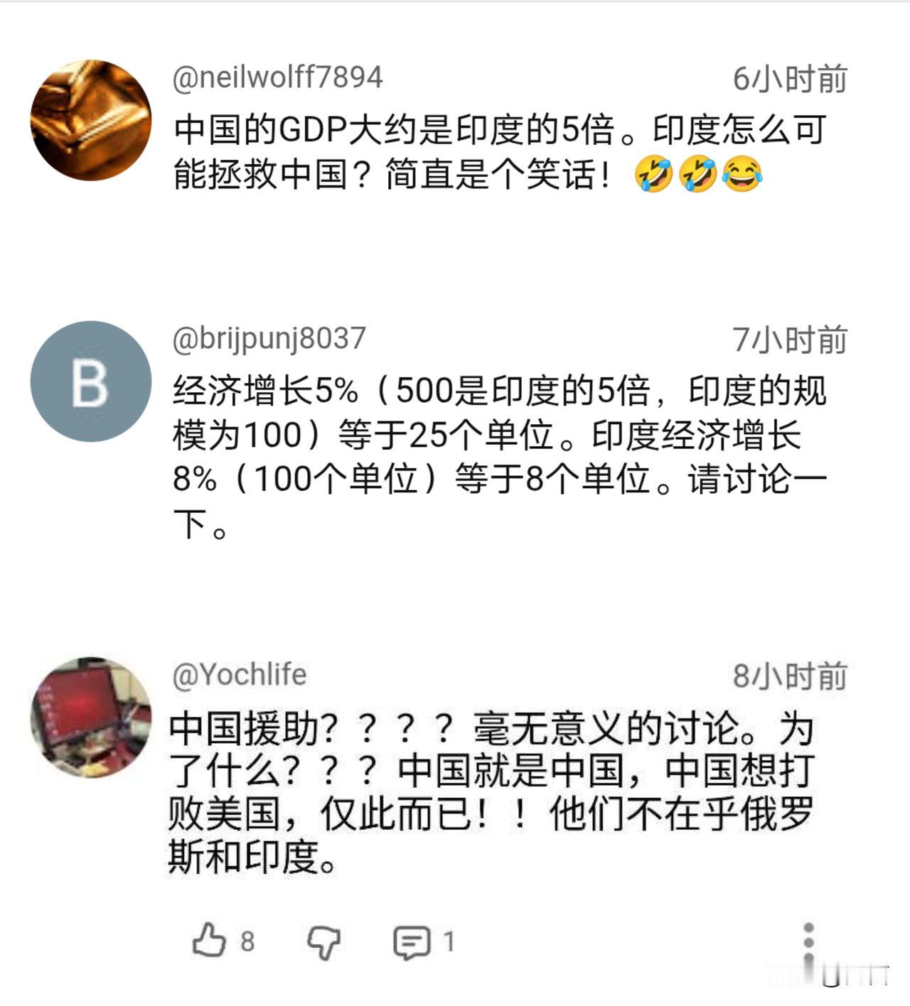 印度应该救助中国吗?别说其他人,就连印度网友此刻都破防了。 12月18日,三位印军退役中将接受了电视台的专访,就印度是否通过贸易让步、投资准入及货币安排等,直接或间接救助中国展开讨论和,并阐述了自己的见解。 消息传出,包括印度网友在内的老外都不淡定。不管从哪方面来说,印度的都远不及中国,更何况以我们现在的综合实力和发展态势还需他人“救助”?当然,要是印度能抛开已见加强与中国合作,我们自然是欢迎…
