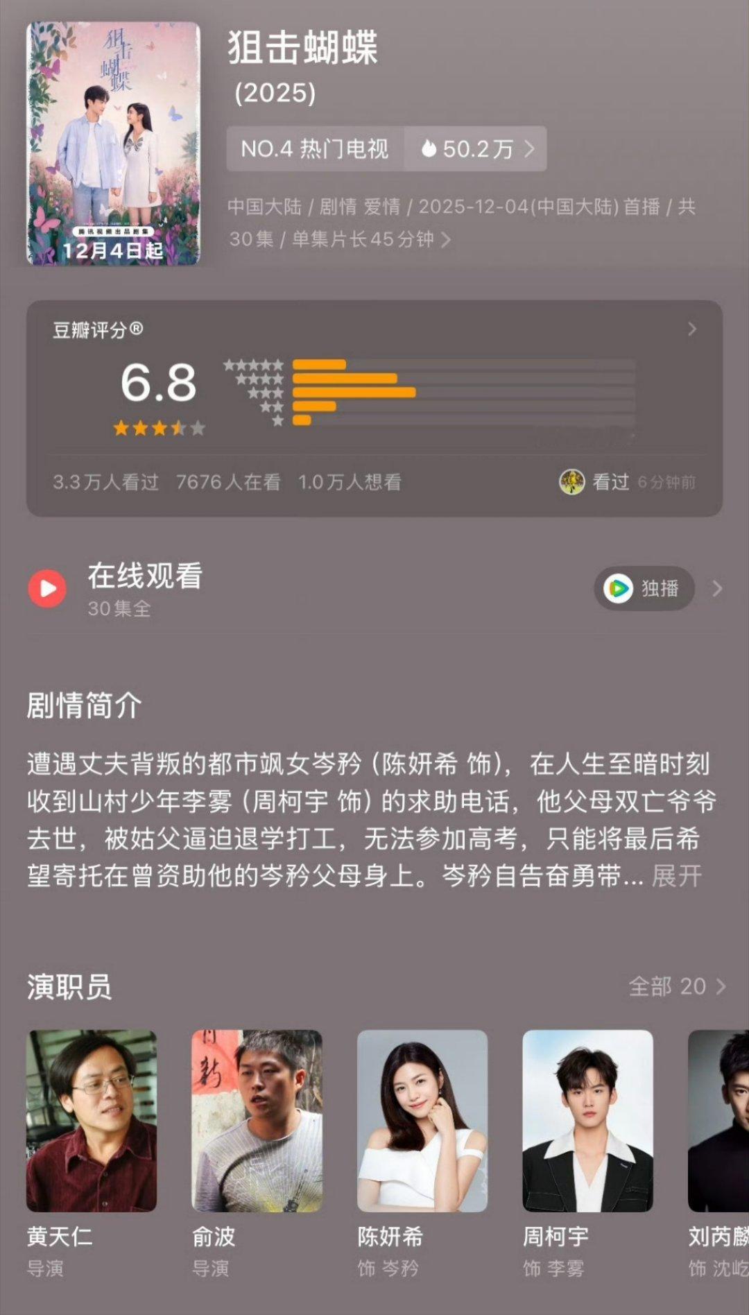 狙击蝴蝶豆瓣开分低了 这分数低得实在让人意难平!剧组用心打磨,演员默契非凡,感情线自然又甜蜜,每一处细节都彰显诚意。如此佳作,不该被如此低估,期待更多人看到它的闪光点!