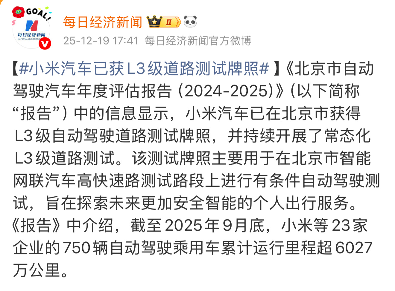 小米汽车已经在北京市获得L3级自动驾驶道路测试牌照,并持续开展了常态化L3级道路测试。