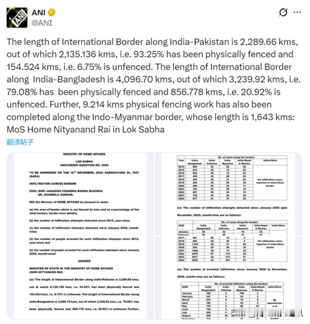 《世界一体新闻台》(WION)12月16日报道,印官方数据显示,过去十余年印边境渗透事件频发,其中印孟边境按占比最高。据悉,2014年至2025年11月,印累计逮捕23926名从巴基斯坦、孟加拉国、缅甸、尼泊尔、不丹边境非法入境人员。数据显示,印孟边境被捕人员最多,达18851人,随后依次是印缅边境、印巴边境、印-尼-不丹边境,而中印边境在统计期内未报告任何非法入境案件。分析指出,印西部和东部边境面临持续渗透压力,边境安全长期面临挑战。另据悉,由于印孟边境非法入境等问题频发,印已加紧在印孟边境修建围栏,但也屡次因此对孟爆发外交摩擦。