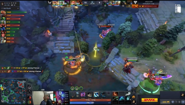 [3:45]上路Xxs夜魔追击越塔Pure拍拍后反被击杀,莲花池旁fy花仙子TP回家,下路哥哥巨魔狂砍Ari小鱼,但后者残血逃生。