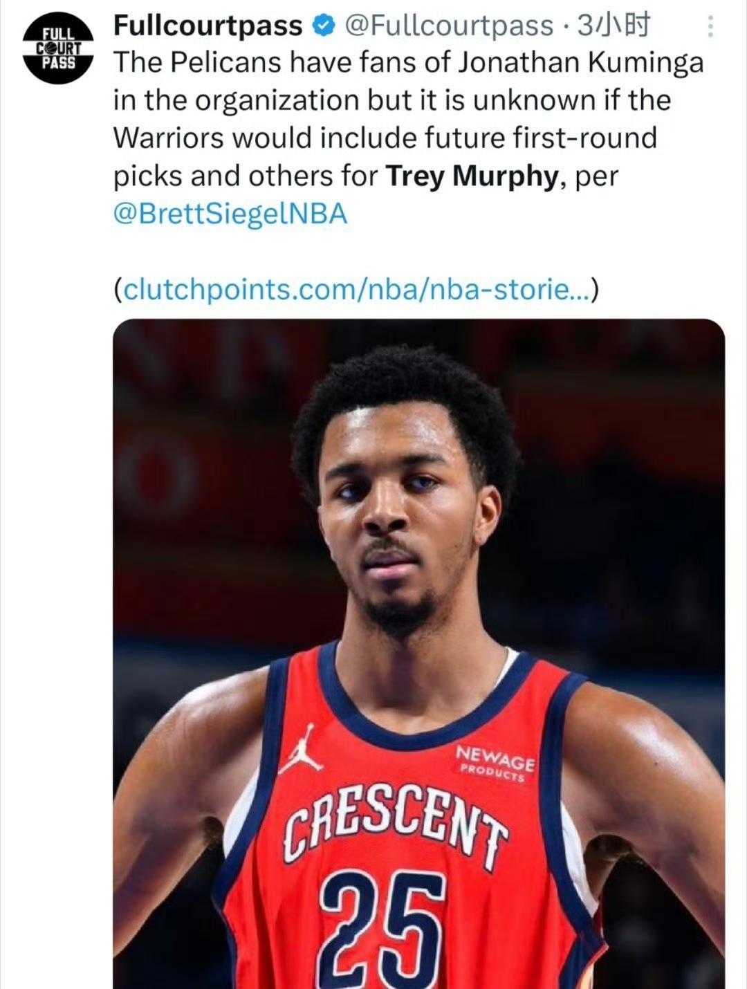 Brett Siegel: 特雷-墨菲三世仍然是勇士的一个交易目标,同时库明加在鹈鹕队内部有一些支持者。 但目前尚不清楚,勇士是否会愿意为墨菲付出未来首轮以及其他球员。Siegel表示,和鹈鹕进行的任何交易谈判,都需要付出多个首轮签作为基本筹码。 墨菲本赛季出战26场,场均21.3分6.4板3.5助1.7断,投篮49.6%,三分36.7%,他的合同还剩下4年1.12亿。