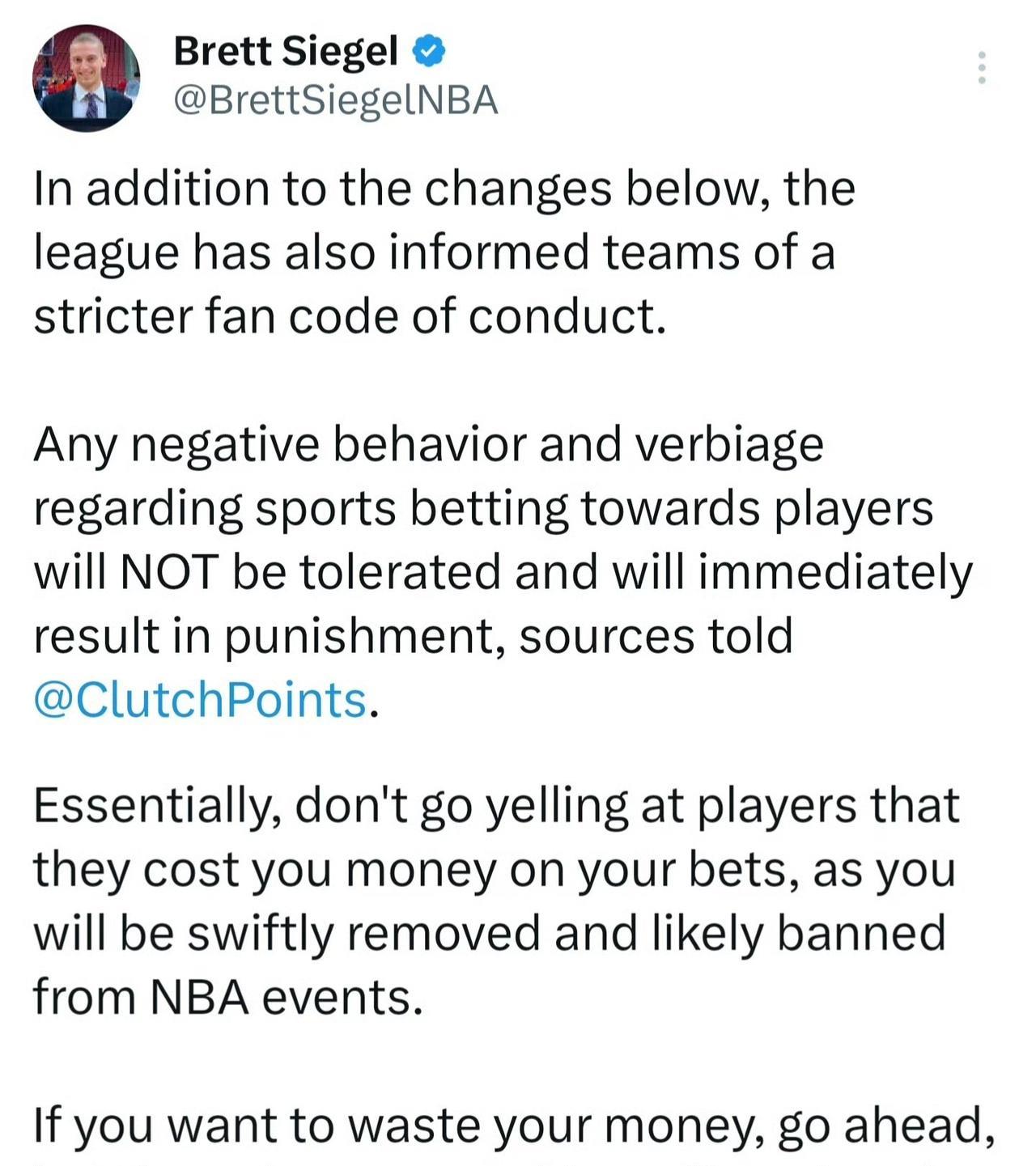 NBA也正尝试对博彩公司进行限制,减少针对个别球员的某些道具投注,包括:限制单名球员的最高投注金额,限制可参与投注的球员数量范围,以及进一步限制,甚至彻底取消某些投注类型。 此外,NBA还通知各支球队,将执行更严格的球迷行为规范。任何针对球员、与体育博彩相关的负面行为或言语都将零容忍,一经发现将立即受到处罚。 简单来说,不要冲着球员大喊,说他们害你在赌注上赔了钱,否则你会被迅速请出场馆,甚至很可能被禁止参加 NBA 相关活动。
