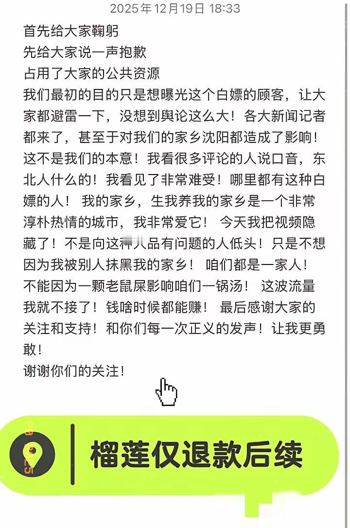 “榴莲仅退款”迎来了大结局,没想到最后道歉的不是买榴莲仅退款的女子,而是水果店的老板,老板说,文旅联系他了,他不得不下架了视频。 有网友问,榴莲钱退了吗?老板回应说,已经退了,某团已经把钱退给他了。 老板说,因为这件事舆论很大,很多人去问仅退款的女子口音是哪里的?被认出是东北的后,有人就去说东北人怎么怎么的,一些很难听的话! 这结局真让人憋得慌!理亏的白嫖者没道歉,维权的老板反倒要下架视频,最离谱的是还扯出了地域攻击。一个人的不道德行为,凭啥让一整个地区的人背锅? 老板那句“一颗老鼠屎坏不了一锅粥”说得太实在,白嫖和地域无关,只和个人素质挂钩。平台该管的是恶意退款的人,而不是让守规矩的商家受委屈。别让地域标签盖过了是非对错,更别寒了老实人的心。你觉得该怎么治这种恶意仅退款的行为?
