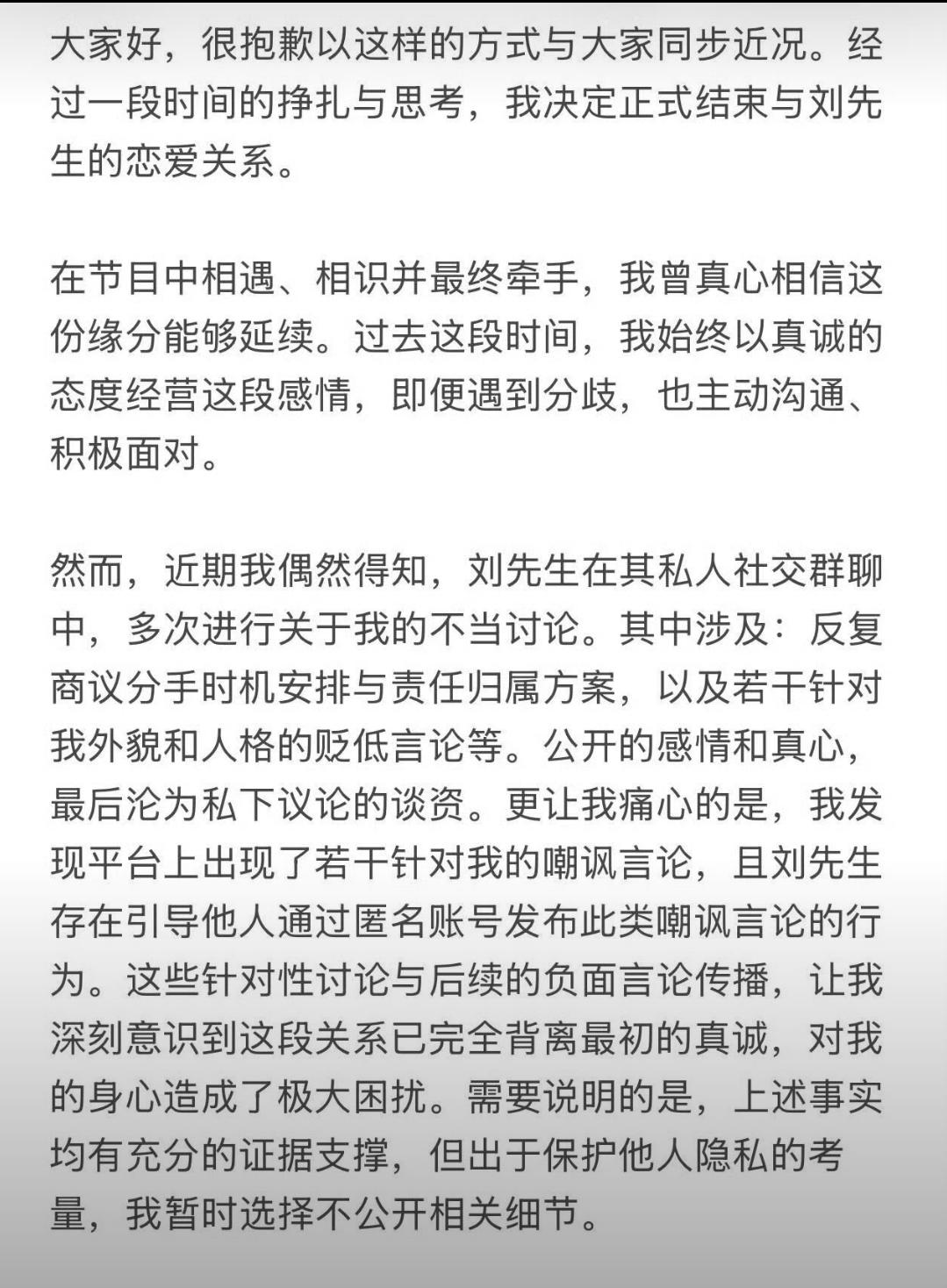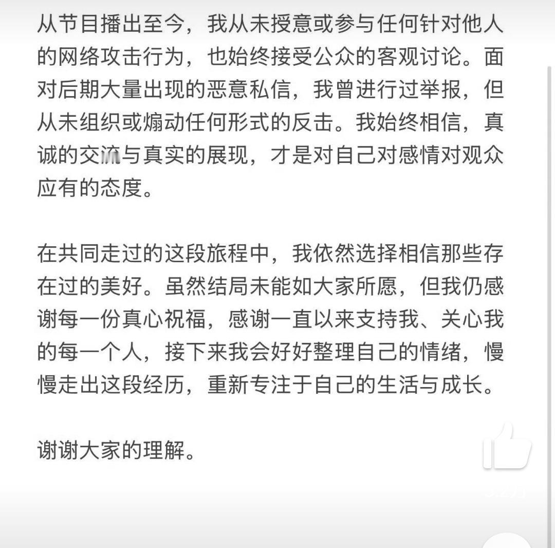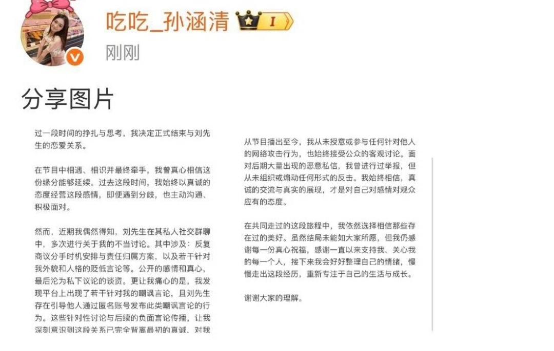 我去!恋综又一对走到头了,《心动信号8》孙涵清和刘子晗官宣分手。更离谱的是,“吃吃”出来解释:刘先生在私人社交群里多次发表关于自己的不当言论,直接把人雷到。现在刘子晗还没回应,网友已经开始脑补群聊内容有多炸裂。甜的时候有多上头,分的时候就有多刺心,恋综这售后真是让人又爱又恨。