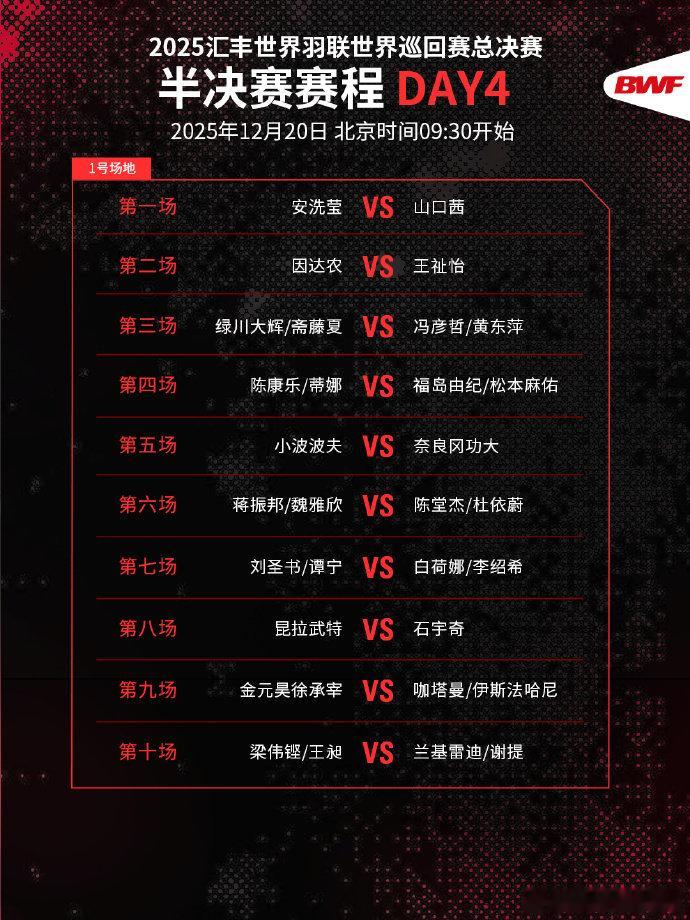 世界羽联年终总决赛半决赛赛程 国羽冲击6个决赛席位2025世界羽联年终总决赛半决赛今日打响,王祉怡、冯彦哲/黄东萍、蒋振邦/魏雅欣、刘圣书/谭宁、石宇奇、梁伟铿/王昶冲击决赛席位。【早场9:30】第一场:安洗莹vs山口茜第二场:王祉怡vs因达农 第三场:冯彦哲/黄东萍vs绿川大辉/斋藤夏 第四场:陈康乐/蒂娜vs福岛由纪/松本麻佑第五场:小波波夫vs奈良冈功大【晚场17:00】第六场:蒋振邦/魏雅欣vs陈堂杰/杜依蔚第七场:刘圣书/谭宁vs白荷娜/李绍希第八场:石宇奇vs昆拉武特 第九场:金元昊/徐承宰vs咖塔曼/伊斯法哈尼第十场:梁伟铿/王昶vs兰基雷迪/谢提看BWF总决赛上咪咕