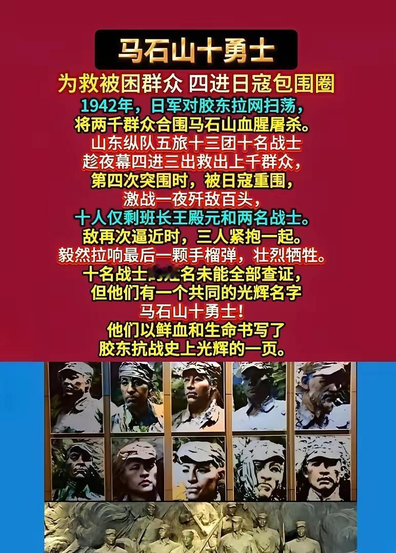 马石山的惊雷:十勇士逆死而生 这是什么概念?当两千群众被日军合围屠杀,只有十名战士逆向冲入死地。他们四进三出撕开封锁线,把生的希望一次次递给百姓,却把死亡留给自己。最后一刻,三人紧抱拉响手榴弹!那不是绝望,是中华民族永不屈服的惊雷。我们可能不知道他们全部的名字,但必须记住:有一群人曾为我们这个民族,粉身碎骨。致敬,永远的马石山十勇士! 时间拨回到1942年的胶东大地,侵华日军纠集两万多兵力,对胶东抗日根据地发动了惨无人道的“拉网大扫荡”,马石山正是这场浩劫里的一座绝地。数九寒天里,日军的铁蹄踏碎了山村的宁静,机枪和刺刀把两千多名手无寸铁的百姓逼到了山坳里,包围圈越缩越小,死亡的阴影笼罩在每个人心头,绝望的哭喊声在寒风里听得人肝肠寸断。 就在这千钧一发的时刻,一阵急促的脚步声冲破了死寂——八路军胶东军区五旅十三团的十名战士,本已冲出了日军的封锁线,却在山脚下听到了百姓的呼救。没有丝毫犹豫,这支由王殿元带队的小队伍,毅然掉转方向,朝着最危险的包围圈杀了回去。这一去,就是一场以十敌千的生死较量。 他们兵分几路,借着夜色和熟悉的地形,像一把把尖刀插进日军的封锁线。第一次冲进去,他们领着数百名群众,从日军防守最薄弱的山缝里钻了出去;折返回来第二次,又带着老弱妇孺,沿着悬崖峭壁上的羊肠小道突出重围;等到第三次、第四次冲进包围圈,战士们的子弹已经打光了,刺刀也卷了刃,身上的棉衣被鲜血浸透,却依旧咬着牙,把最后一批群众护送出了死地。 日军的包围圈越收越紧,战士们的身影被敌人的火力死死咬住。等到把所有百姓都送出险境,十名勇士已经被围困在马石山的顶峰,身边再也没有可以掩护的屏障。子弹打光了,就用石头砸;刺刀拼弯了,就用拳头和牙齿搏杀。血战到最后,阵地上只剩下了三名战士,他们被日军逼到了悬崖边,身后就是万丈深渊,面前是密密麻麻的敌人。 没有一个人退缩,没有一个人求饶。三名战士相视一眼,眼神里没有丝毫惧色,他们紧紧抱在一起,拉响了最后一颗手榴弹。一声巨响震彻山谷,浓烟散去后,悬崖边只剩下被鲜血染红的岩石,还有那面弹痕累累的军旗,在寒风中猎猎作响。 这场战斗结束后,人们在山上找到了勇士们的遗体,有的还保持着冲锋的姿态,有的手里还攥着断裂的步枪。后来清点才知道,这支十人的小队伍,靠着四进三出的拼杀,硬是从日军的屠刀下救出了一千多名百姓,而他们自己,却无一人撤退,全部壮烈牺牲。 他们中,有稚气未脱的少年,有身经百战的老兵,很多人甚至没来得及留下一张照片、一句遗言。但他们用生命诠释了什么叫“人民子弟兵”,什么叫民族脊梁。在那个山河破碎、风雨如晦的年代,正是千千万万个像马石山十勇士这样的人,用血肉之躯筑起了一道坚不可摧的长城,挡住了侵略者的铁蹄。 如今的马石山,青松翠柏四季常青,山风掠过树梢时,仿佛还能听到当年那声震撼人心的惊雷。那不是死亡的哀鸣,而是中华民族永不低头的呐喊。我们或许记不住他们每个人的名字,但我们永远不会忘记,在这片土地上,曾有一群勇士,为了保护百姓,逆死而生,粉身碎骨。 你还知道哪些像马石山十勇士一样的抗日英雄故事?欢迎在评论区分享,让更多人记住这些不朽的名字!