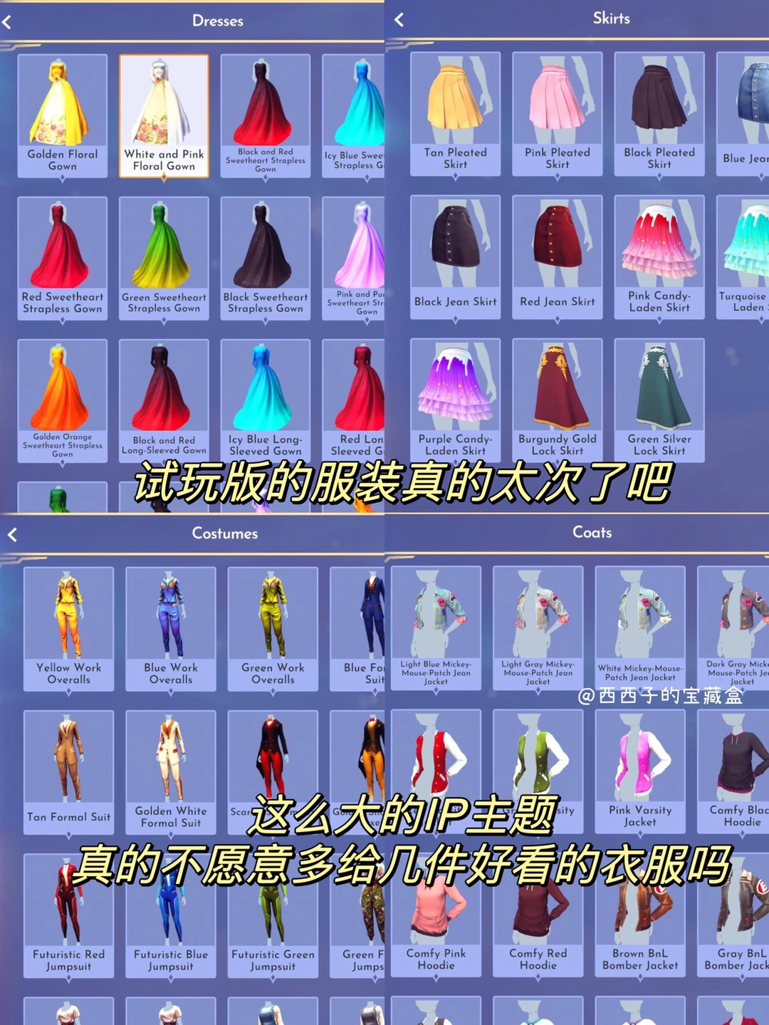 [扯脸H]浅玩了一下迪士尼梦幻星谷试玩版~ [石化R]捏脸玩法真的太简单了,就是用各种迪士尼人物的五官组合,🎨顶多调一下颜色,很贴合迪士尼的主题! 毕竟怎么捏都看起来像公主!!!(但个人觉得人物建模略显粗糙) · [捂脸R]另一个想哭的就是,真的是太穷鸟~ 👗衣柜里面就没有几件好的衣服,或许这就是贫穷玩家们的??? [汗颜R]那啥或许因为地图NPC才是重点? [皱眉R]但还是球球多裳两件衣裙给玩家们吧~大家觉得呢?
