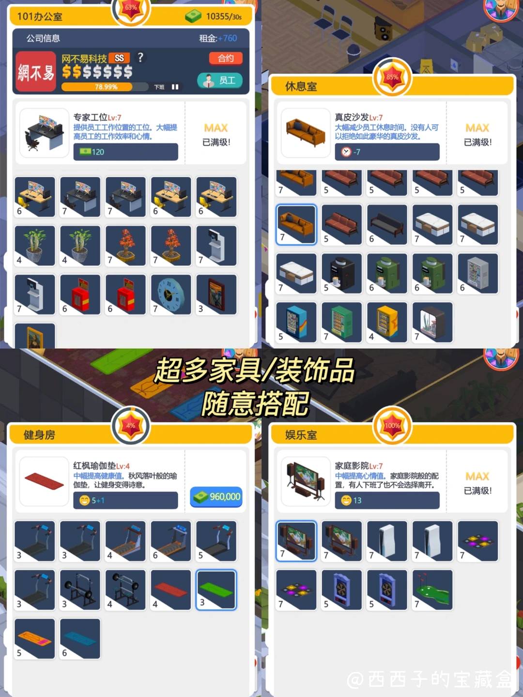 🛋️设计娱乐室、餐饮室,按你的喜欢搭配布局大厦,这里的玩法类似房屋布置,💺只是风格偏向职场办公室。