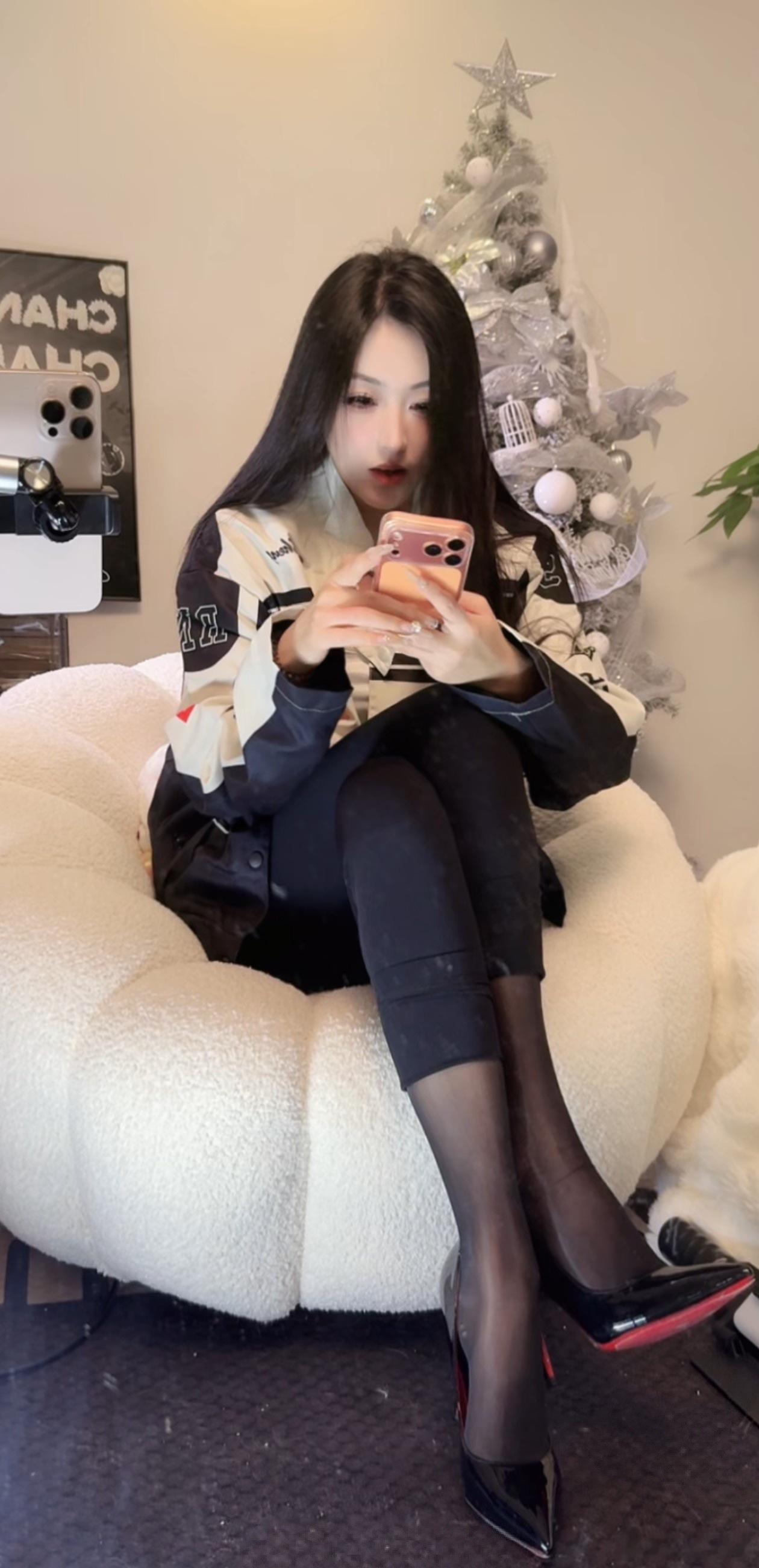 这位小姐姐穿着蓝黑连衣裙,坐在沙发上。
