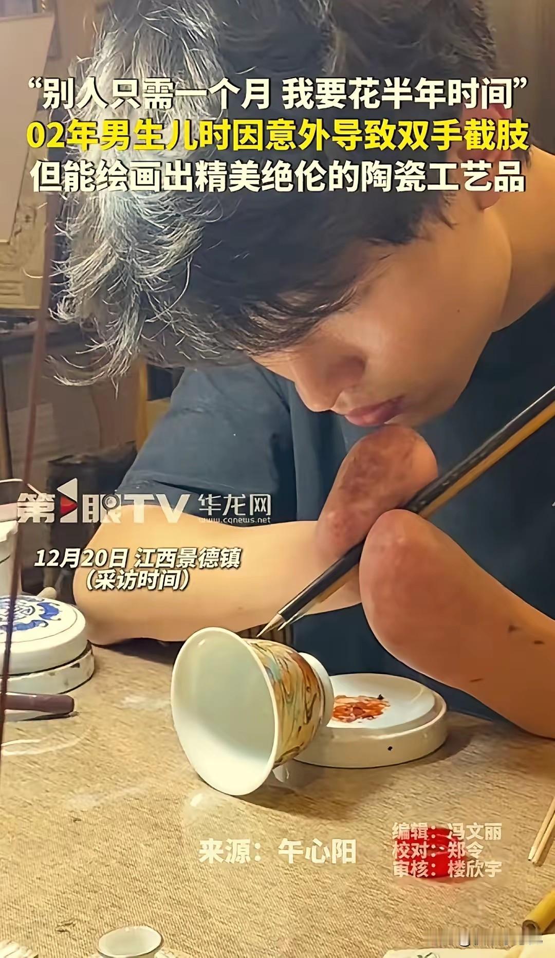 “太励志了!”江西景德镇,一男生擅长在瓷器上作画,画作栩栩如生精美绝伦,本以为是天赋型选手,结果凑近一看直接破防:他竟然没有双手,全靠手腕夹着笔在瓷上作画!别人练习线条只需一个月,他却要硬生生的熬了半年。 景德镇自古就是瓷都,街头巷尾都飘着瓷土的清香,在这儿把瓷上画做好的,没一个是等闲之辈。可谁能想到,这位让游客驻足惊叹的画师,连握笔的双手都没有。 初见他作画,手腕用力夹住细细的画笔,胳膊肘撑着桌面保持稳定,哪怕是画一根细细的兰草,都要调动全身的力气。瓷面光滑,笔墨稍重就会晕开。手腕上磨出的厚茧,是日复一日练习留下的勋章。 别人练一个月的线条,他要熬半年,没有双手,每一步都比常人难百倍。刚开始笔杆总从手腕间滑落,夹笔都夹不稳,墨水洒在洁白的瓷坯上,像一个个刺眼的印记。 他的作品里,有灵动的花鸟鱼虫,有景德镇的青山绿水,每一笔都栩栩如生。 很多人说他是天赋型选手,可只有他自己知道,所谓天赋,不过是把别人放弃的时间,都用来打磨技能。他没有双手,却用一颗坚韧的心,稳住了笔下的作品。 他的作品不仅卖得好,更成了景德镇瓷文化里一道特别的风景。他身上那股不服输的劲,更让人动容,比起那些有手有脚却总抱怨“太难了”“学不会”的人,他的坚持更显珍贵。 作品的背后,是他无数次的失败与重来,是手腕酸痛到抬不起来,无数个挑灯夜战,咬牙坚持的结果。 这位男生,没有双手,没有抱怨命运不公,都能把日子过成诗。真正的励志,从来不是天生自带光环,而是在命运给你关上一扇门时,而是硬生生地用坚持凿开一扇窗。他用手腕画出的,不只是精美的瓷画,更是对生活最热烈的告白。
