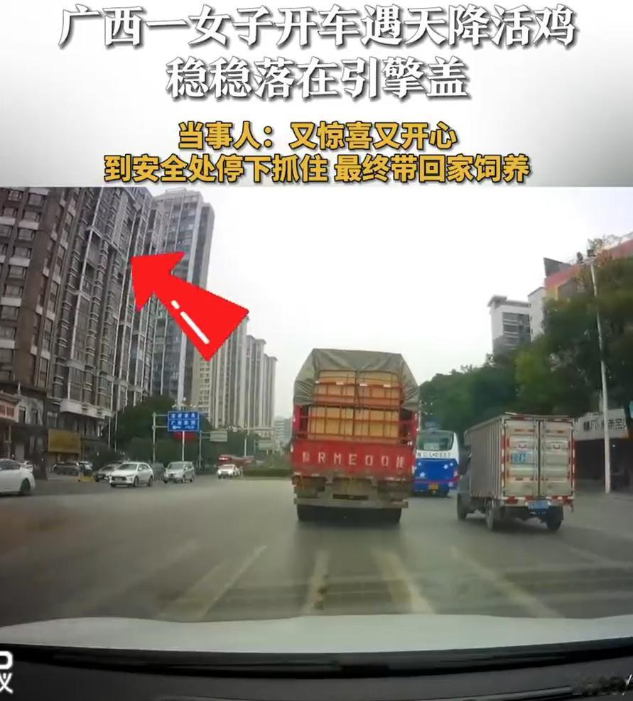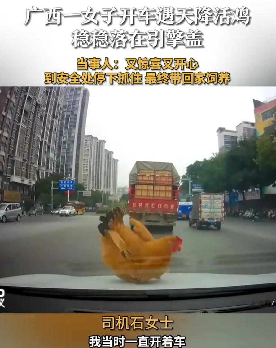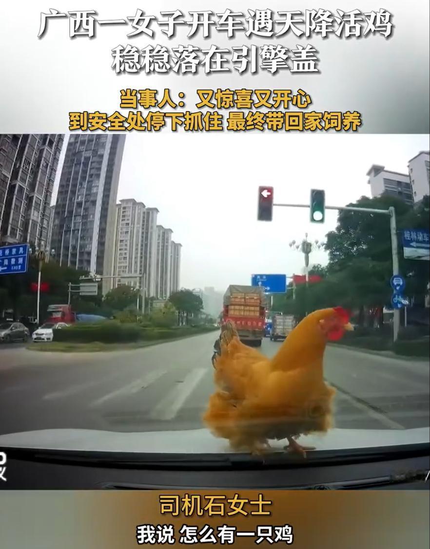 真天赐良鸡!广西桂林,女子在路上开车时,忽然一个影子从天而降,啪一下落在引擎盖上,定睛一看,居然是只活生生的大鸡。这鸡也淡定,不飞也不跑,就稳稳站着,像搭顺风车一样 石女士称,当时自己先是吓了一跳,等回过神来,觉得又稀奇又好笑。天上没掉过馅饼,倒掉了只活鸡。她慢慢把车开到安全地方,停稳,伸手把鸡给抱住了。带回家后,也没舍得吃,就给养了起来 这事传到网上,大家都乐了,纷纷猜这鸡是哪来的。有网友说,估计是从运鸡的货车上蹦出来的,路上颠簸,笼子没关严,鸡就“越狱”了 也有网友表示,可能是谁家阳台或院子里养的,扑腾出来,正好落在车上。总之,这是一只有点运气、又有点迷糊的鸡,砸中的是一辆恰好路过的车 其实我觉得,比起鸡的来历,更值得一说的是司机的处理方式 很多突发事件,真正的分水岭就在那一两秒。不是鸡有多危险,而是人一慌,手和脚先乱了。猛打方向、急刹,本能上像是在躲风险,现实里反而是在制造更大的风险。车道上还有别的车,后面也未必给你留反应时间,一下失控,事情性质立刻就变了 所以说,这位司机最难得的地方,不是她后来把鸡带回家,而是当下没被吓着节奏。车子稳住,方向不乱,先保证安全,再找地方处理问题。这个顺序很重要,很多事故就是把顺序搞反了,先情绪,后判断