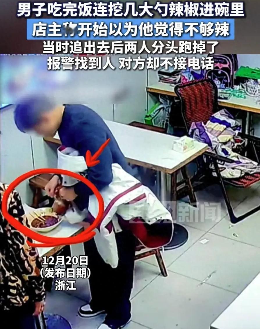 “必须严惩!”浙江,一男子去面馆吃饭,结果吃完后没有立刻离开,反倒把邻座的辣椒酱拿过来,整罐倒进了吃剩的碗里,等老板发现时,对方立刻跑远,虽然不值多少钱,但男子的行为气的老板又是报警,又是发监控曝光 监控显示,当时一个二十岁出头、染着紫色头发的年轻小伙,跟朋友进来吃牛肉面。两人吃得挺投入,中途他还加了两次辣椒,热得把羽绒服脱了。吃完面,碗里就剩点汤水,朋友都站起来等着走了,他却没动 接着,他做了一件让人看不懂的事,转身把邻桌的辣椒酱整罐拿过来,先是舀了好几勺,后来干脆把剩下的小半罐全倒进自己碗里。倒完还笑了笑,把罐子放回去,用筷子搅了两下。碗里顿时一片红彤彤的,可他一口没再吃 店家一开始也没在意,想着有客户爱吃辣,多放点辣酱很正常,等看着他出门才反应过来:这不是纯粹糟蹋东西吗?老板赶紧追出去喊他,那小伙一听,头也不回,拉着同伴就跑没了影 有网友说:一罐辣椒油不值几个钱,但这种行为真是太缺德了,一点不珍重别人的劳动成果,同时也丢了自己和同路朋友的人格,这种行为真不值得看好 这话说的没错,这件事之所以让人火大,不在于损失了多少钱,而在于那种明摆着的恶意。不是不懂规矩的小失误,是清楚自己在干什么,还专门等吃完、准备走的时候来这么一下。跑得这么快,说明他自己也知道理亏 很多人会说,年轻人可能就是图个乐子,开个玩笑。问题在于,这种乐子建立在别人劳动和成本之上。面馆里的每一罐辣椒,都是老板花钱买的,也是下一个客人要用的。你不吃,却全倒掉,相当于把别人的时间和钱随手扔进垃圾桶。要是每个客人都这么玩,这店一天都开不下去 还有一点很现实。这种行为看着小,性质却不轻。监控清清楚楚,动机明确,逃跑行为也摆在那。一旦较真,完全可能升级为纠纷,甚至要面对处罚。为了这么点无聊的刺激,换来被曝光、被追责,怎么算都不划算