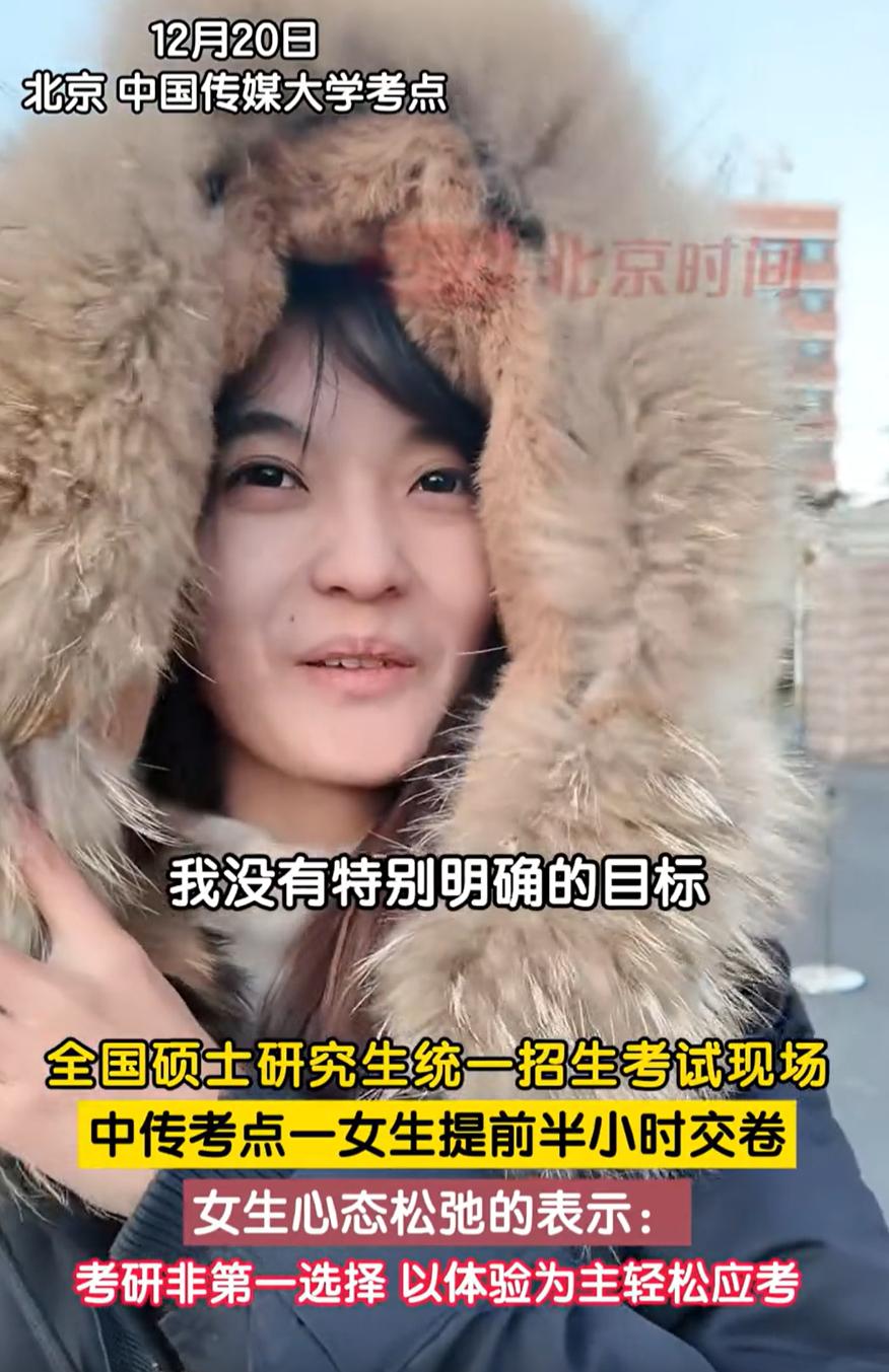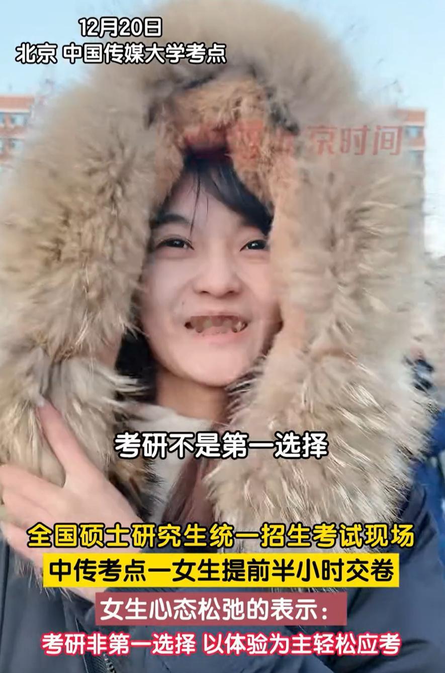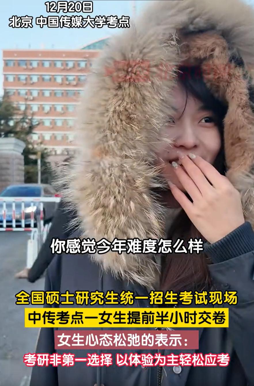 “这心态真好!”北京。中国传媒大学考研考点内,一名女生提前半小时交卷离场。有记者好奇上前询问她的目标院校是哪里,但女生的回答却出人意料,她表示考研并非第一选择,此次纯属体验 视频中,能看出来女生的状态相当松弛,完全不像紧张备考的那种状态,走出考场后,在接受采访时也是全程笑呵呵。记者询问说感觉这次考试难度怎么样,女生回答说还好 随后记者又询问了目标院校是哪里,女生想了一秒后,回答说并没有明确的目标,因为考研不是自己的第一选择,更多就是今年来体验一下 而女生的回答和状态,也引起了不少网友的讨论 有网友说:人家考研呢,肯定不会跟你说考什么学校啊,被竞争对手知道了又是个不确定因素 也有网友表示:这是有工作或者是后路了,不认真了,只有没有工作的才会背水一战 其实我倒觉得,这名女生身上最有意思的点,不在于她考没考上,而在于她对考试的定位。很多人把考研当成一次翻身仗,成败直接等同于个人价值,所以走进考场那一刻,心已经被压得很重。一旦结果不理想,打击的不只是前途,还有自信。她选择把考研当成体验,本质上是在给自己留空间。考上是加分项,没考上也不等于失败 这几年,考研人数多,竞争激烈,真正焦虑的往往不是考试本身,而是选择太少。或者对现状不满意,考研就容易被当成唯一出口。这种情况下,紧张和背水一战是常态。反过来看,有规划的人,反而更敢用平常心对待考试 这名女生的做法未必适合所有人,却提醒了一个现实问题。考试只是工具,不是身份标签。心态松,不代表不努力,而是知道自己为什么来,也清楚就算这条路走不通,生活也不会就此停摆。这样的清醒,比提前交卷本身,更难