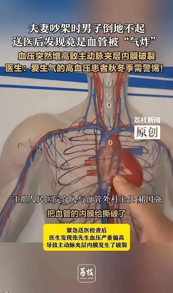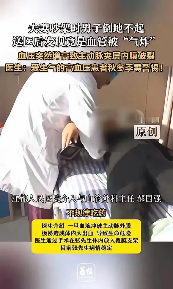 悲剧还是发生了!”近日,江苏扬州,一对夫妻因日常琐事吵架,随着双方语气越来越激烈,丈夫在情绪彻底失控时,突然感觉胸口疼的受不了,随后当场倒地不起,妻子吓坏了,连忙送去医院,结果发现丈夫血管被“气炸”了,有生命危险。 这位姓张的先生本身就有高血压病史,平时血压控制得不算稳定,只是没把这事太放在心上。夫妻俩吵得最凶的时候,他情绪一下子冲到顶点,血压跟着骤然飙升,直接把主动脉夹层的内膜给撕裂了。江都人民医院的医生说,这可不是普通的血管问题,主动脉夹层内膜破裂就像水管壁裂了口子,血液会往夹层里渗,随时可能引发血管破裂,死亡率特别高。 送到医院时,张先生已经出现了休克的迹象,医生立刻启动了紧急救治方案,花了好几个小时才把他从鬼门关拉回来。主治医生郝国强直言,秋冬季节本身就是高血压患者的危险期,气温骤降会让血管收缩,再加上情绪激动,血压波动会变得极其剧烈,很容易诱发这类致命的心血管问题。 很多人都低估了情绪对身体的杀伤力,尤其是本身有基础病的人。生活里的鸡毛蒜皮值得争得面红耳赤吗?张先生和妻子不过是为了日常小事拌嘴,差点就酿成了天人永隔的悲剧。而且不少高血压患者都有个通病,觉得自己没什么不舒服就不用规律服药、不用监测血压,这种侥幸心理真的要不得。 这次事件也给所有高血压患者和家属敲了警钟,情绪稳定不是一句空话,是实实在在的保命准则。 各位读者你们怎么看?欢迎在评论区讨论。