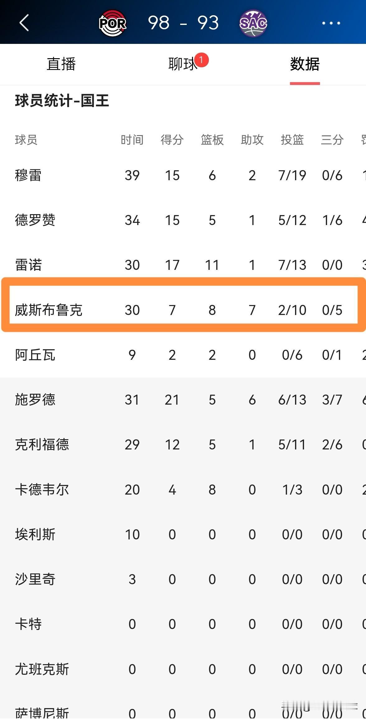 我强烈建议国王老将威斯布鲁克就地退役!在今天国王主场以93:98不敌开拓者的比赛中,威斯布鲁克再次化身“威铁”,他在首发出战的30分钟里,投篮10中2,其中三分球5中0、罚球6中3非常低效的得到7分,他的场上正负值为-21。 作为NBA历史上最伟大的后卫之一,威少在职业生涯的末期屡屡交出如此糟糕的答卷,他真的应该就地退役。